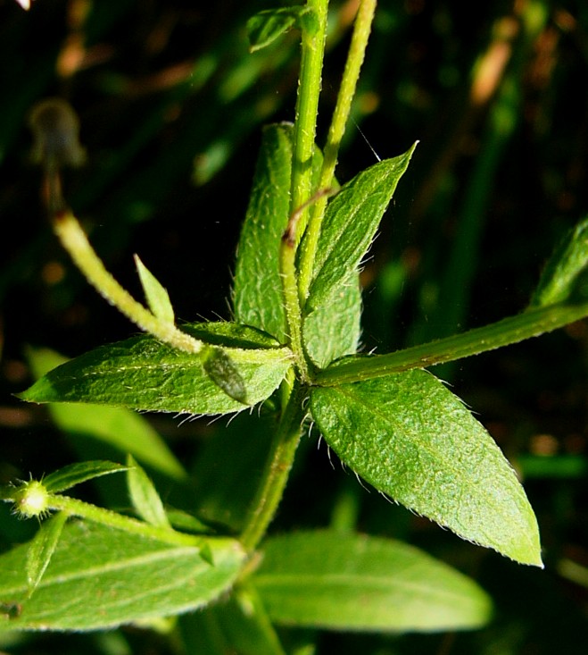 3 Blätter meist deutlich gezähnt, vorne spitz, mit 1,5 mm langen Haaren, Zungenblüten hellblau, 8 - 10 mm lang