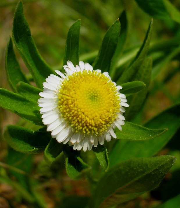 4 Blätter ganzrandig oder gezähnelt, vorne stumpflich, mit 0,7 mm langen Haaren, Zungenblüten weiß oder hellrosa, 6 mm lang