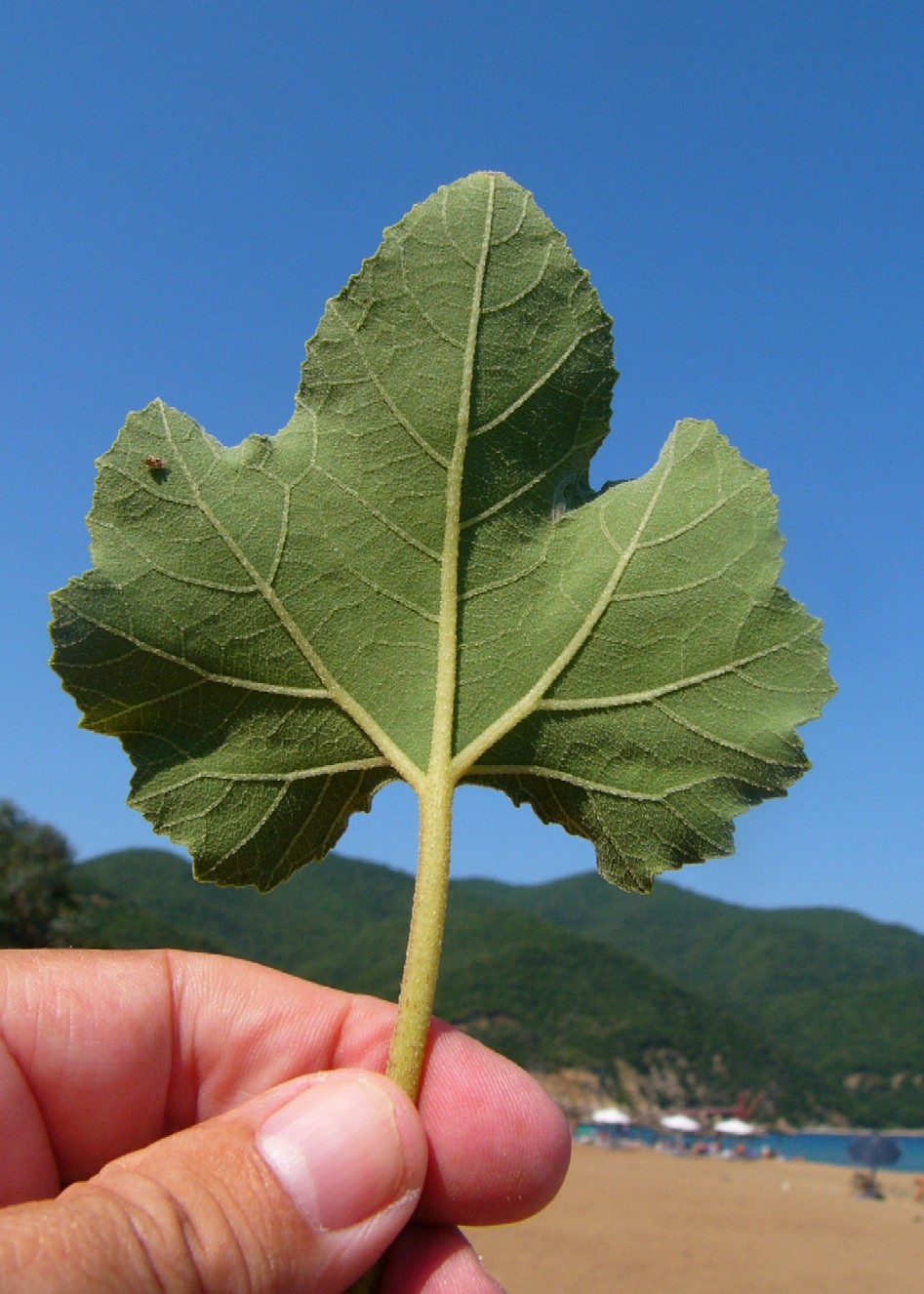 Blätter eiförmig, schwach 3 - 5- lappig, am Grund herzförmig oder keilig, rauhaarig
