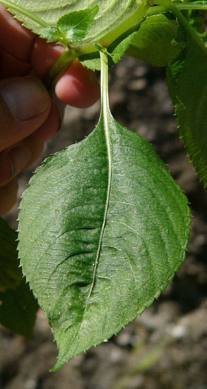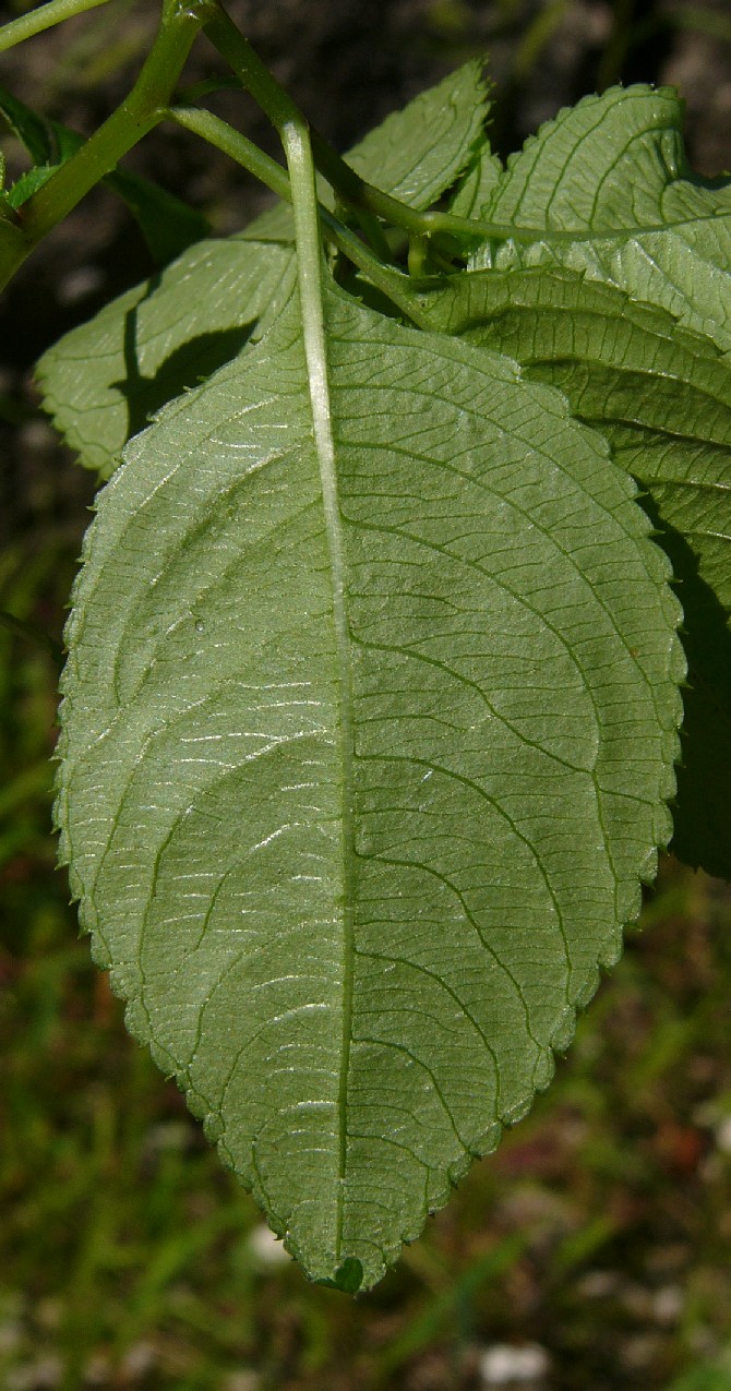 Blätter eiförmig bis elliptisch, mit spitzen Zähnen