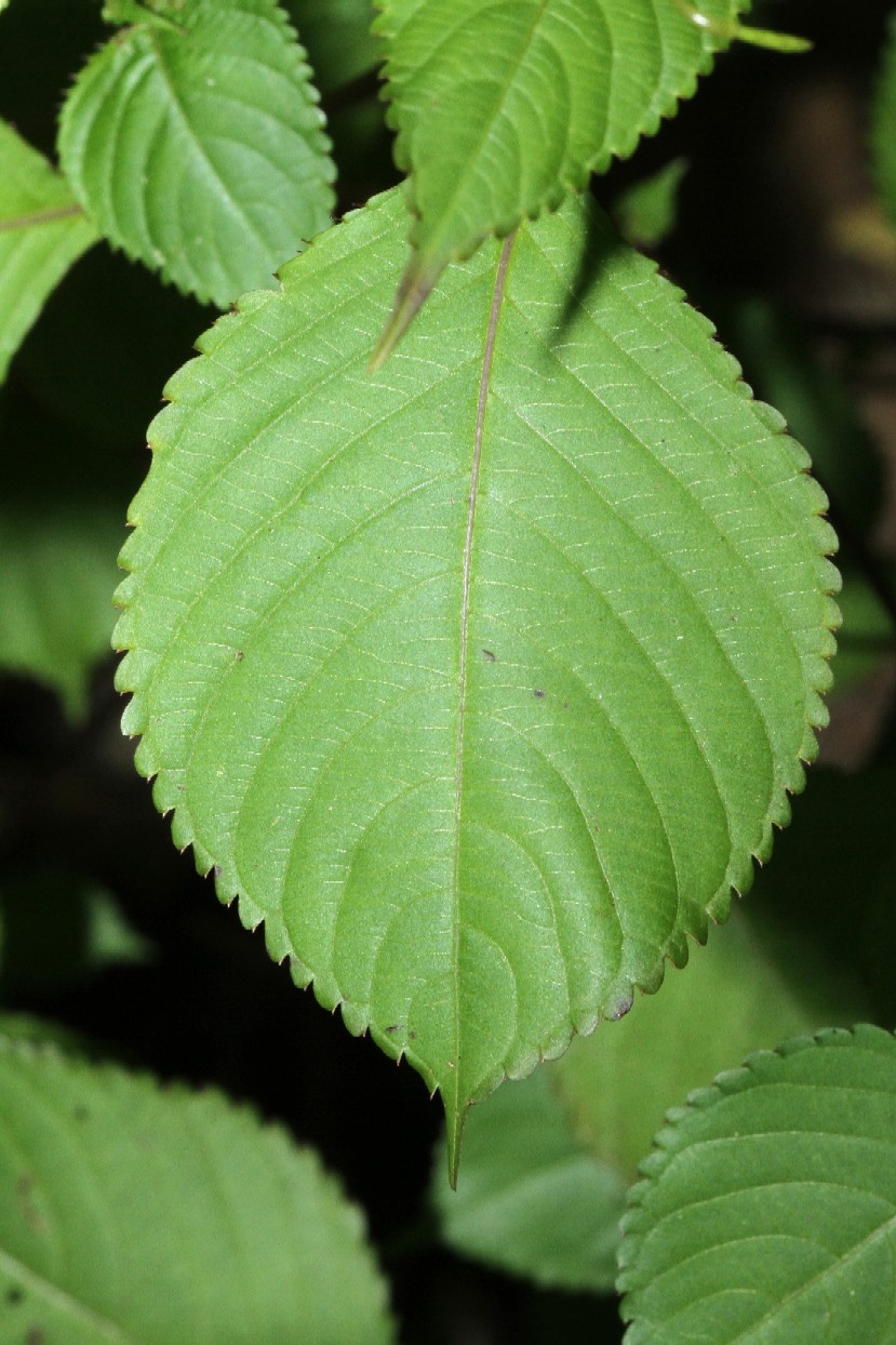 Blätter eiförmig, 9 - 15 cm lang, 2 - 6 cm breit, mit stumpfen Zähnen,
