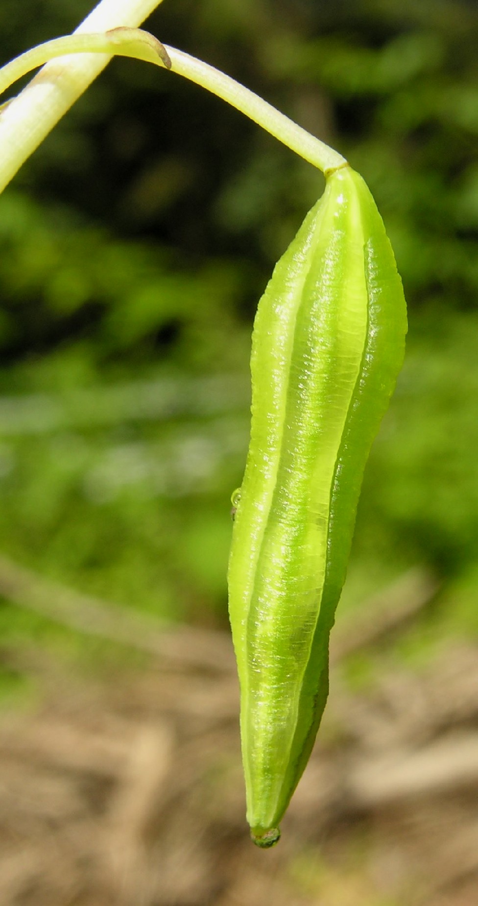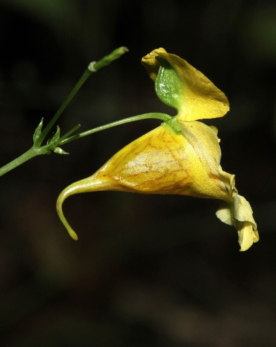 Blüten 20 - 35 mm lang, hängend, mit gebogenem Sporn