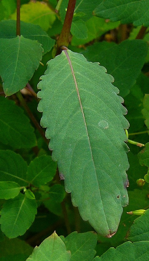 Blätter 4 - 18 cm groß, eiförmig, gezähnt, vorne zugespitzt,