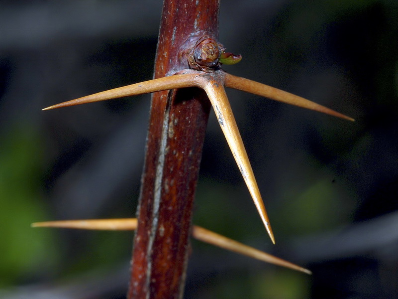 Dornen gelb, glänzend, meist 3- teilig, Mitteldorn meist am längsten