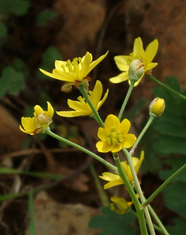 Blüten mit 6 gelben Kelchblättern, 6 gelben, kleinen Nektarblättern (= Kronblätter), Filamente und Staubbeutel gelb oder gelborange, Fruchtknoten oberständig, mit 1 Griffel, Narbe kopfig