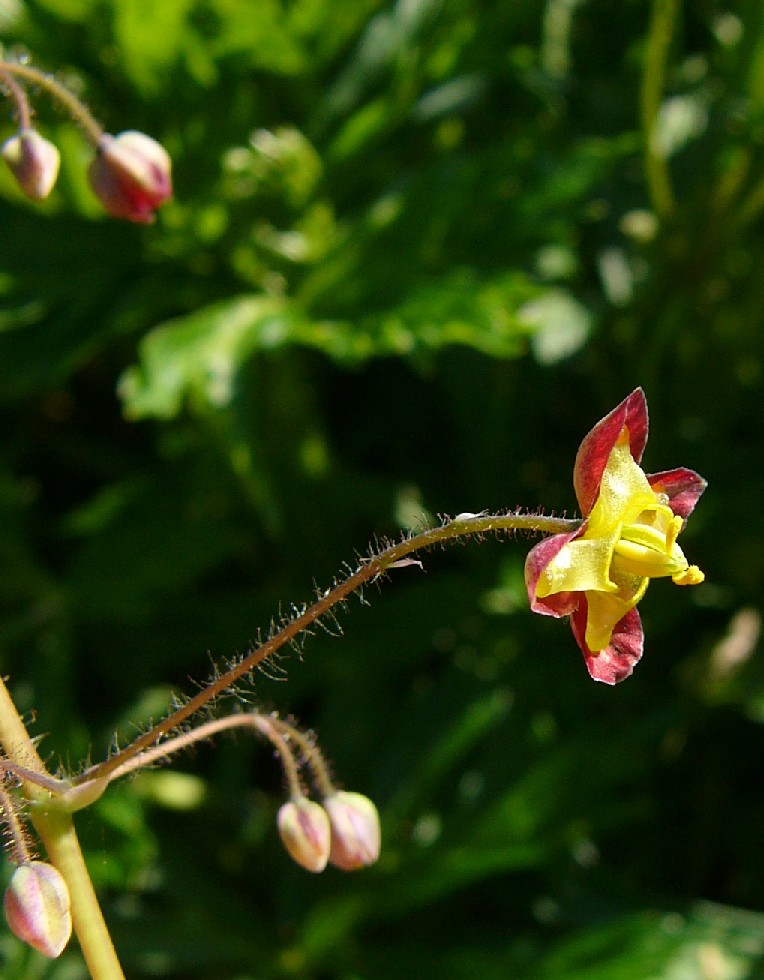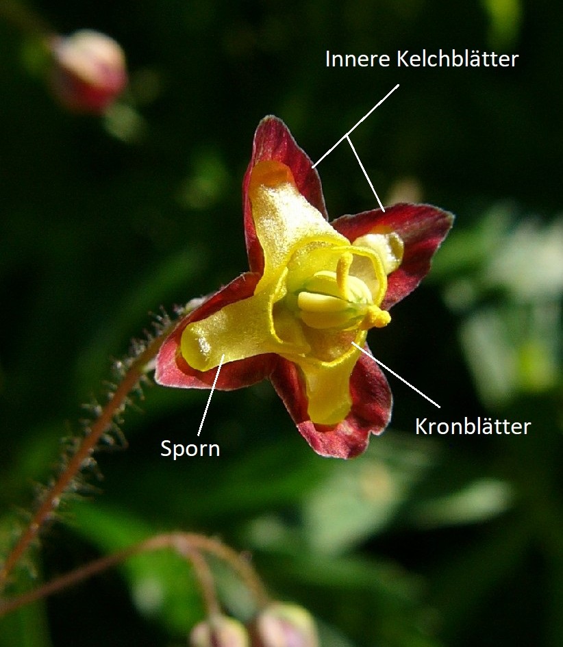 1 Blüten mit 4 grünen äußeren und 4 roten inneren Kelchblätter, Kronblätter zu 4 Spornen ausgezogen