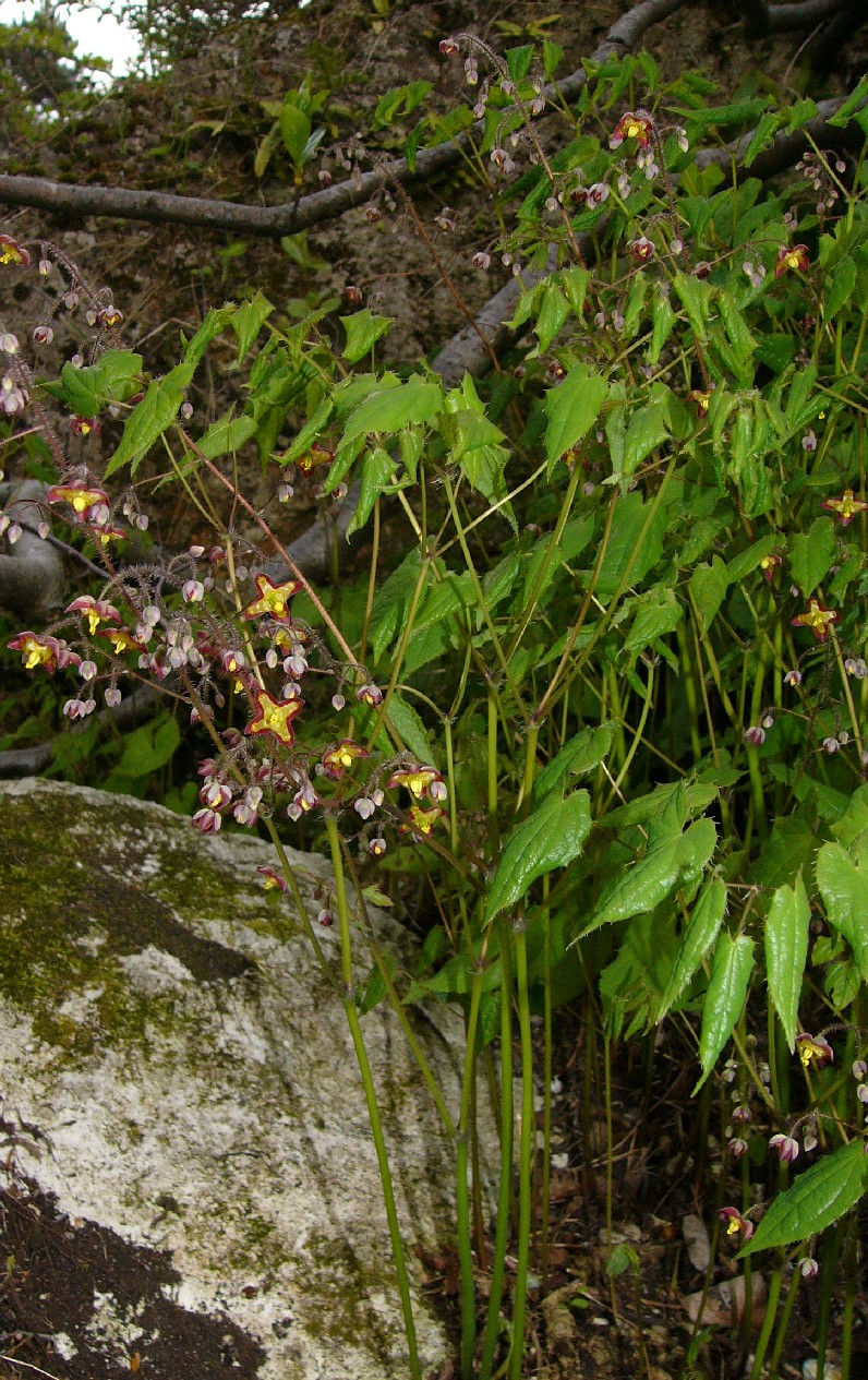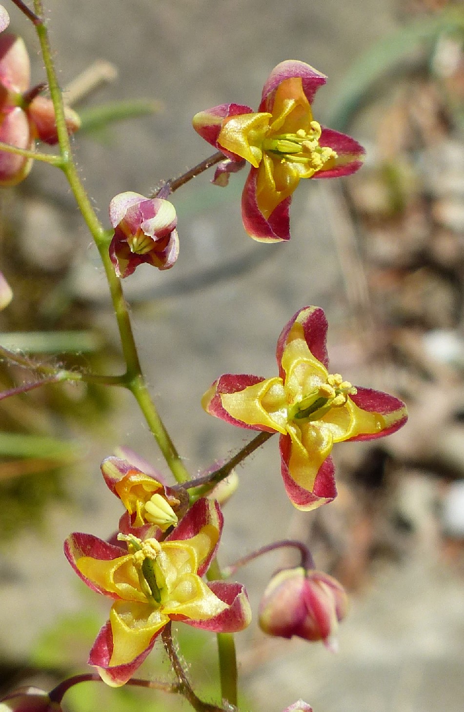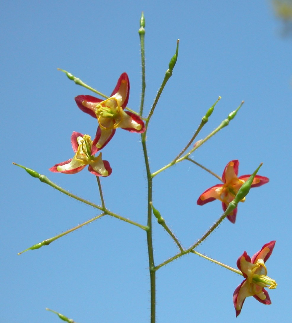 Blüten mit 4 blutroten inneren Kelchblättern und 4 gelblichen, gespornten Kronblättern, Kronblätter kürzer als die inneren Kelchblätter Blüten mit 1 Fruchtknoten, der von 4 Staubblättern umgeben wird