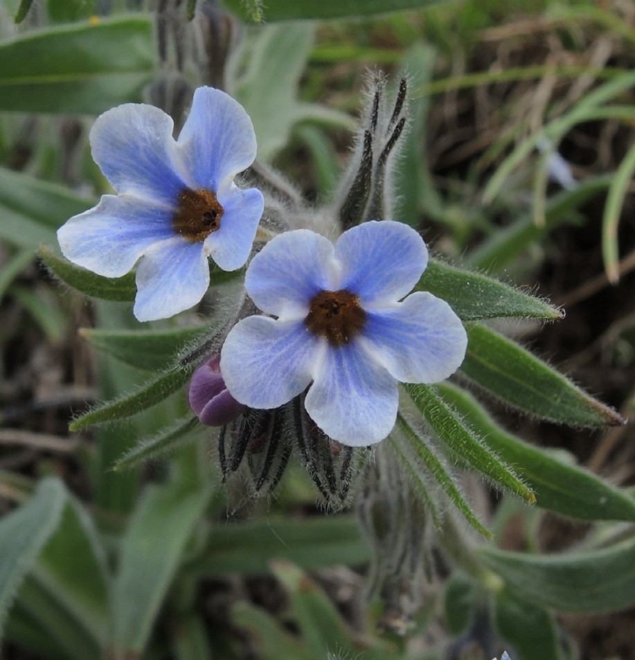 (Parnon- Gebirge) Schnabel der Nüsschen stark umgebogen Krone blau bis malvenfarbig, 11- 14 mm im Durchmesser, > 6