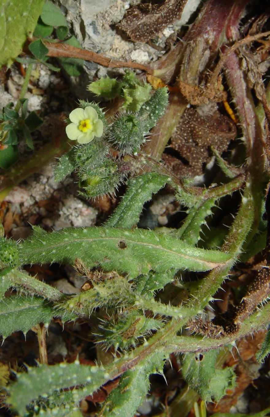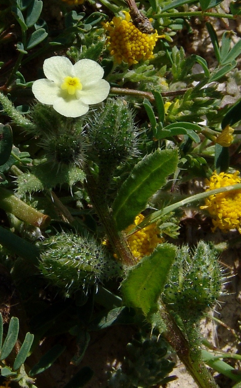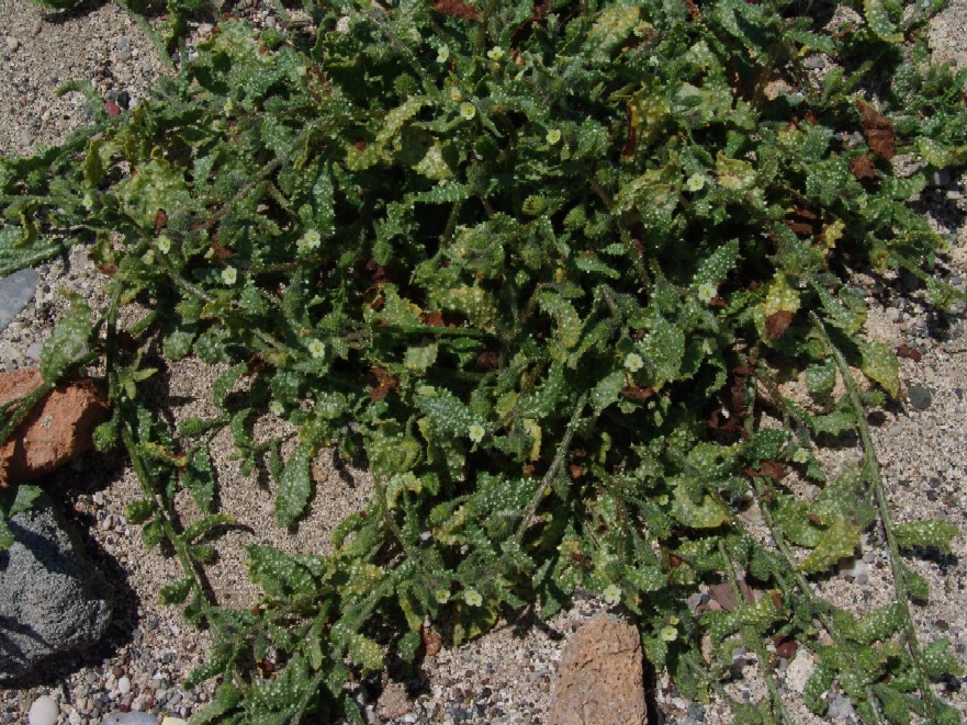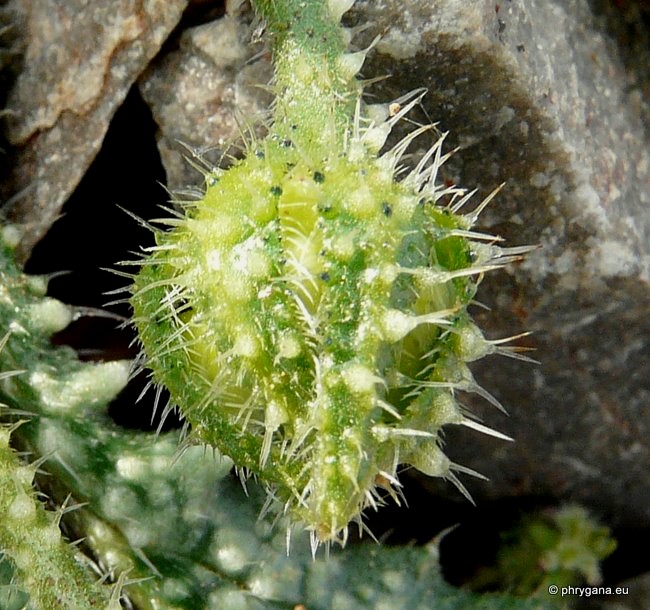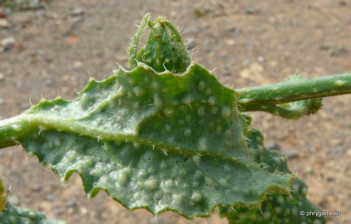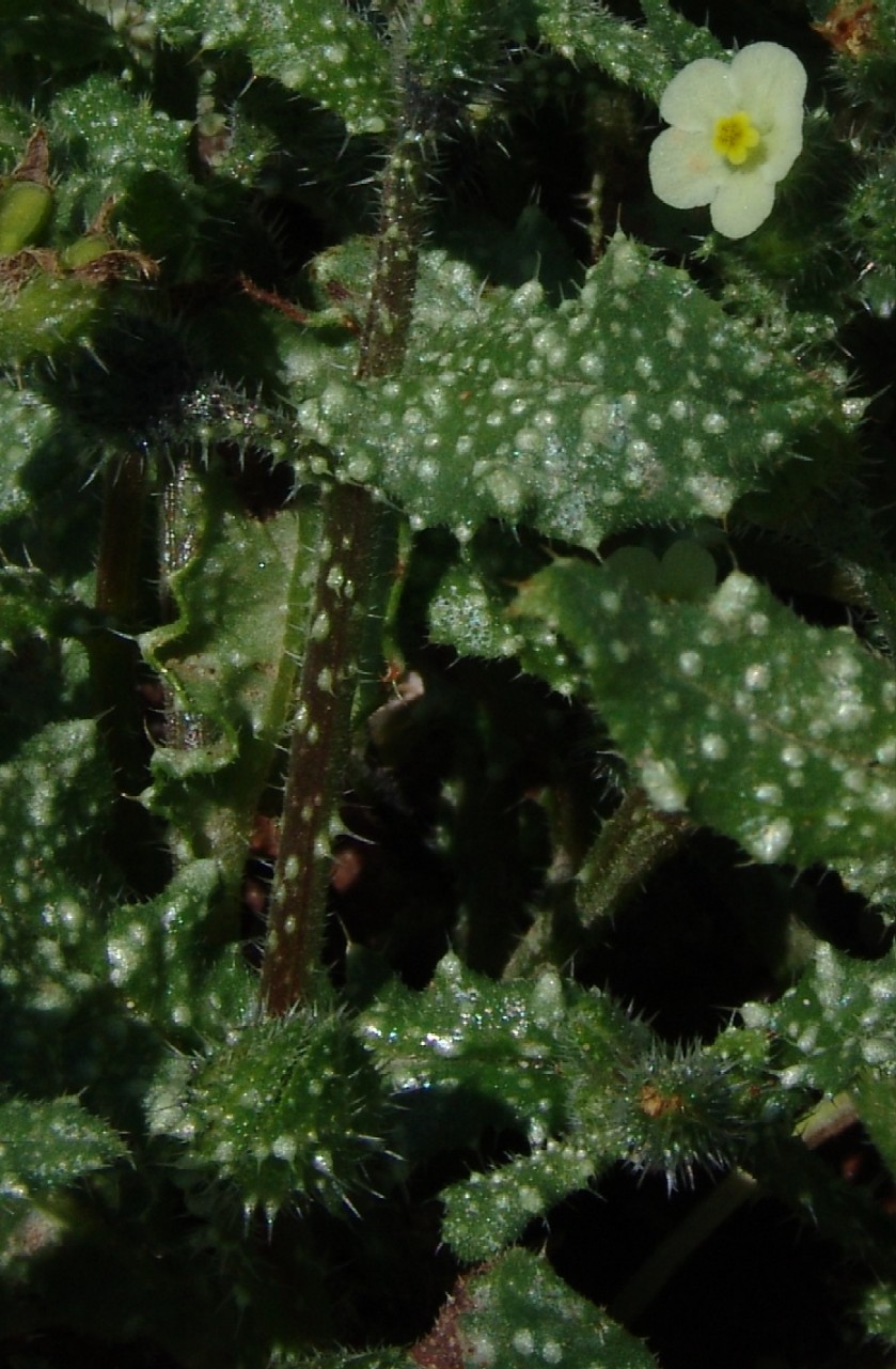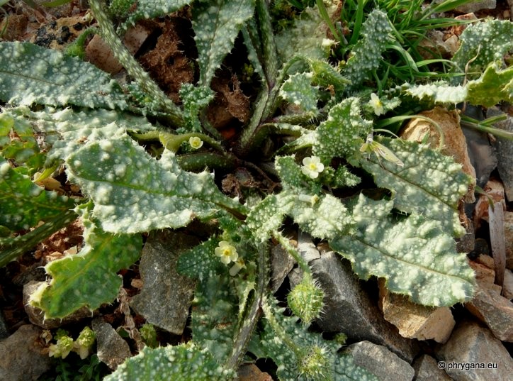Blüten, Kelch fast bis zum Grund geteilt, borstig behaart Blätter mit weißlichen Warzen > 1