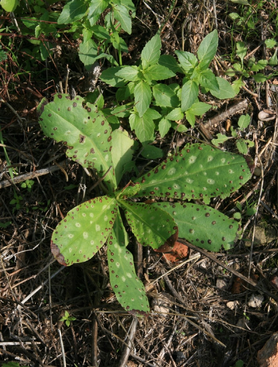 Untere Blätter und Rosettenblätter gestielt, spatelförmig, weißfleckig und warzig