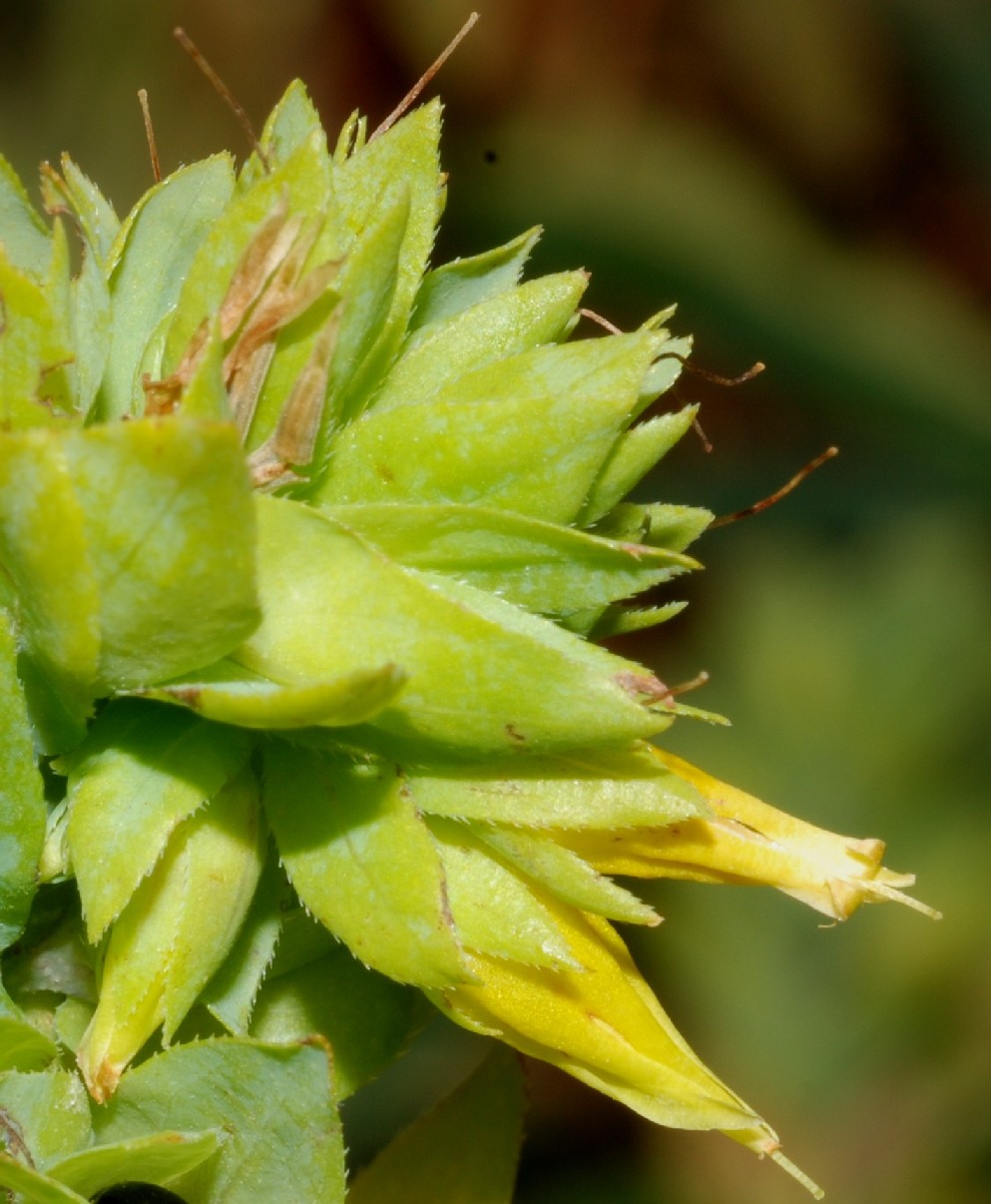 Krone 9 - 10 mm, bauchig, mit oder ohne rotes Band, zu 1/2 - 2/3 in pfriemliche Kronzipfel gespalten, Kelchblätter 2 - 3 mm breit, am Rand gewimpert