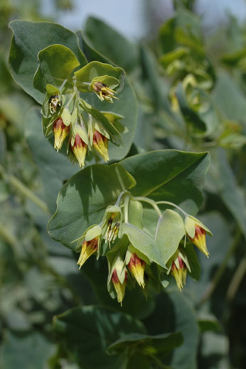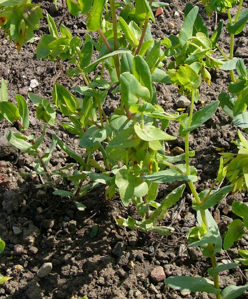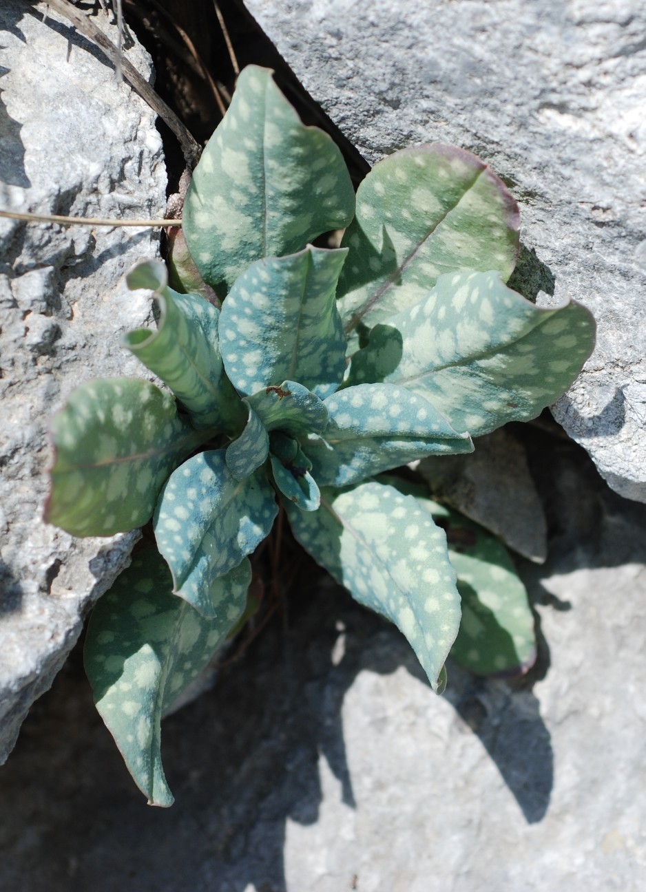 Grundblätter breit oval- spatelförmig, blaugrün, mit weißen Punkten, am Rand oft violett