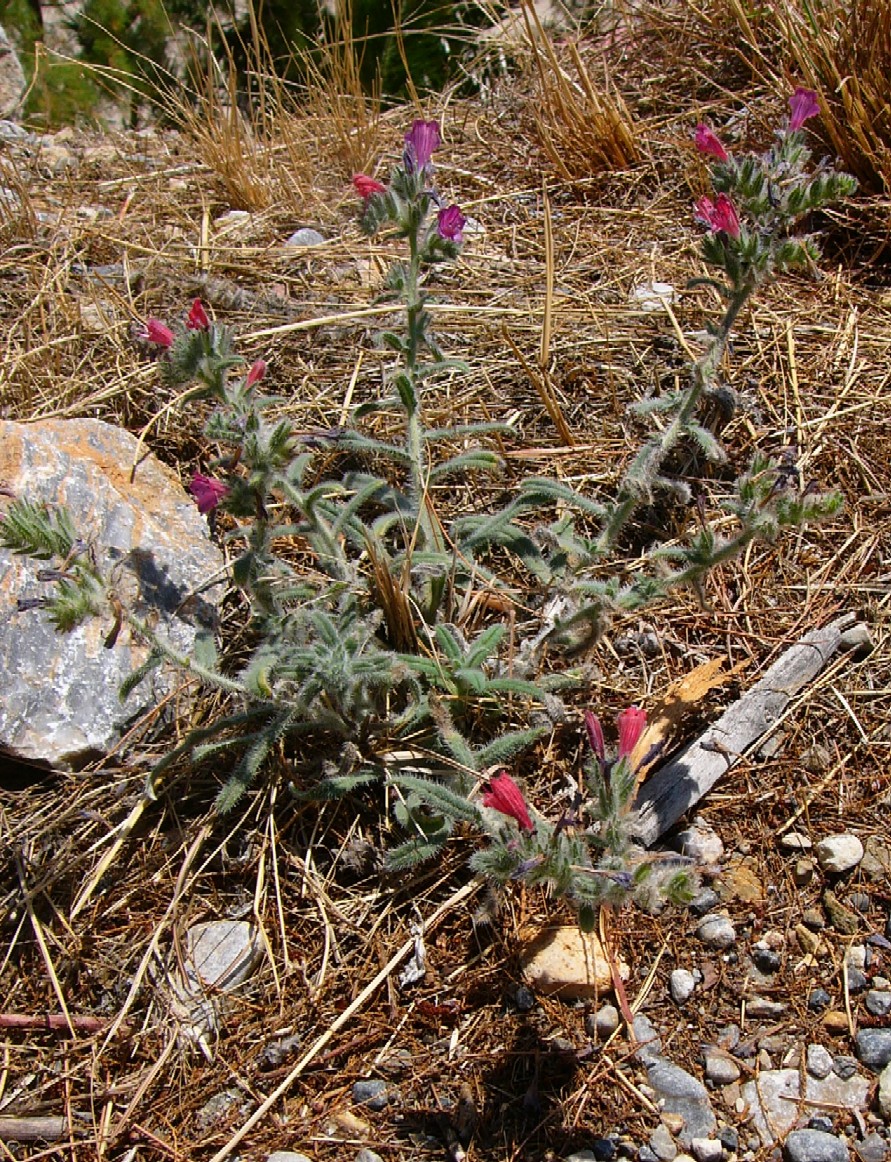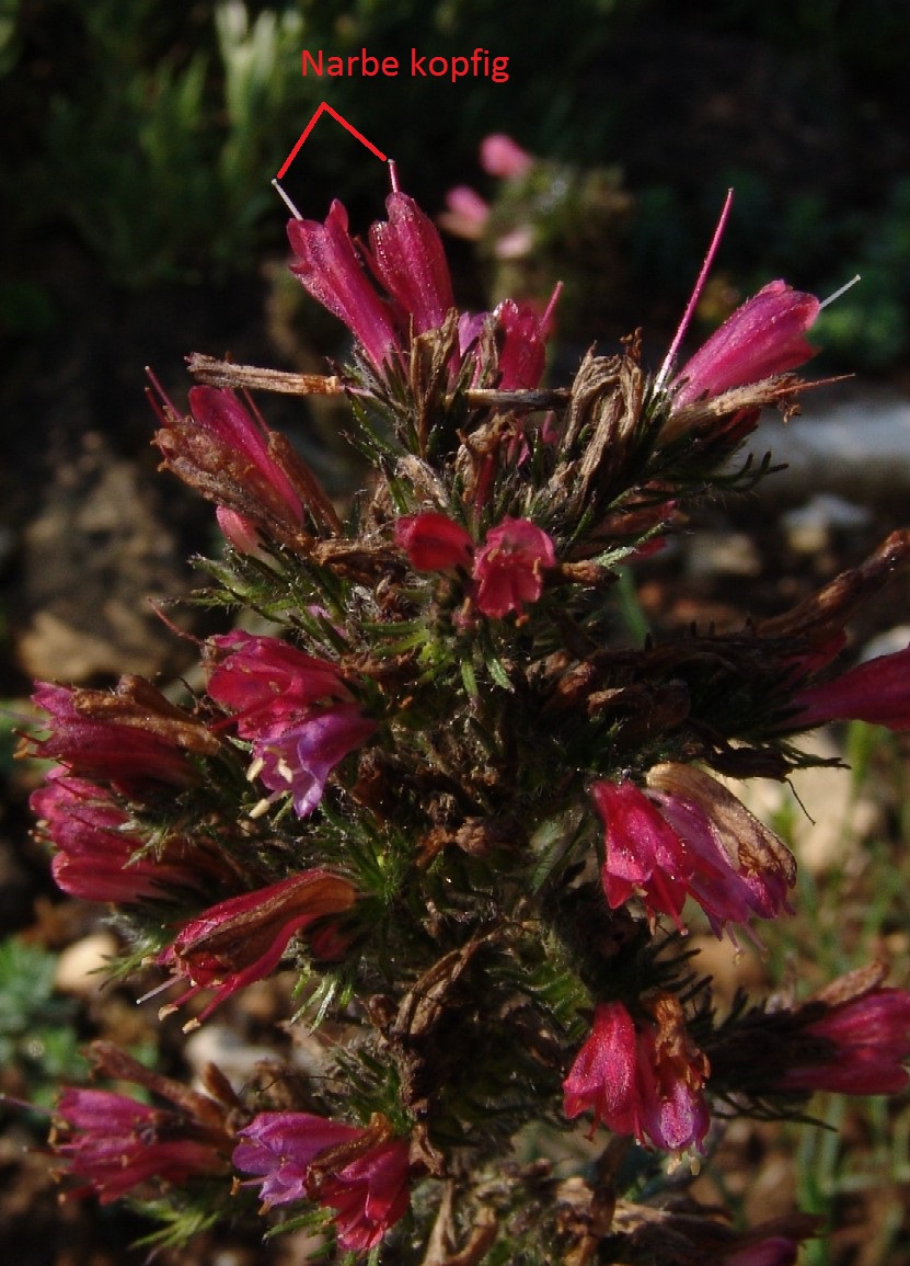 Gebüschen, Zierpflanze Synonyme: English name: Weltweite Verbreitung: Im Catalogue of Life und bei Wikipedia ist diese Pflanze die einzige Art der Gattung Pontechium (monotypisch). Dies wird mit abweichenden Sequenzen von Abschnitten der Kern- und Plastiden- DNA und mit der von allen Natternkopf-Arten abweichenden kopfigen statt zweispaltigen Narbe begründet. In der Flora von Österreich wird sie als Echium maculatum und in der Flora Europaea als Echium russicum gelistet.