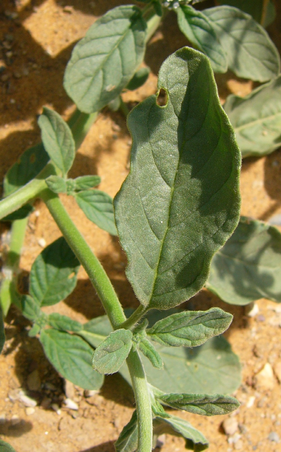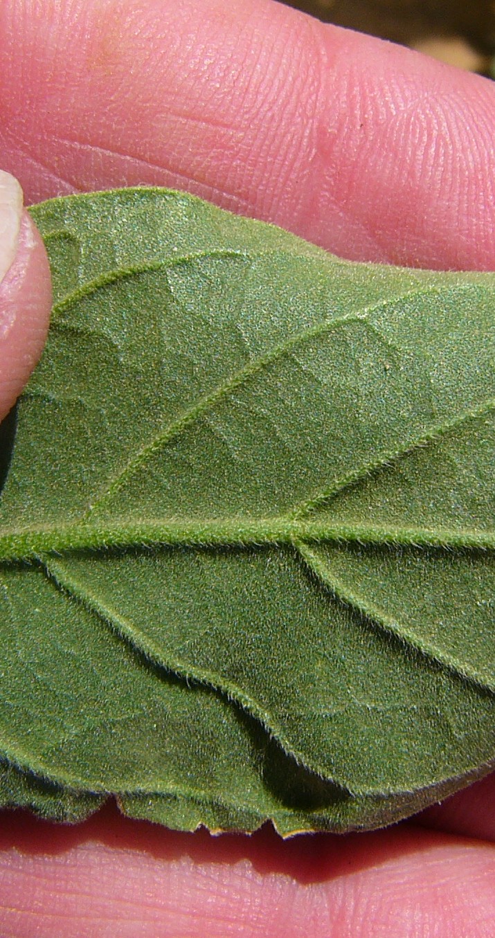 Stängel angedrückt behaart Blätter wechselständig, gestielt, elliptisch, oberseits kahl oder mit sehr kurzen Haaren Blätter unterseits kurzhaarig, auf den Adern mit längeren Haaren