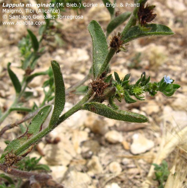 6 Untere Blätter grauhaarig, bis 4 cm lang und 0,4 cm breit, Blüten 5 - 8 mm im Durchmesser, Früchte mit deutlichen Warzen zwischen den Stacheln