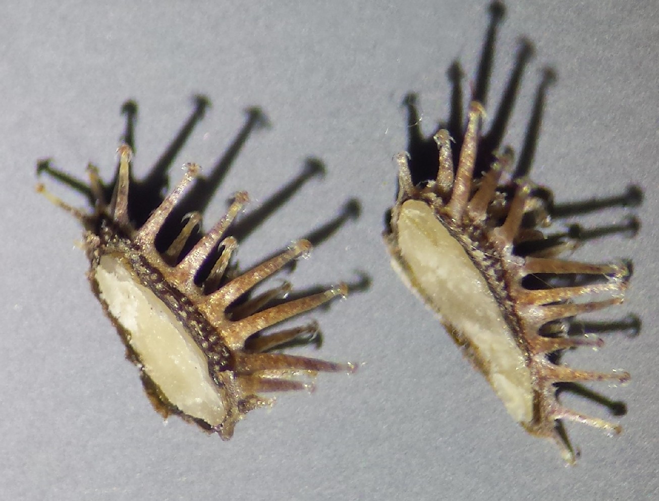 Teilfrüchte mit 2 Reihen widerhakiger Stacheln, d.h. pro Frucht 8