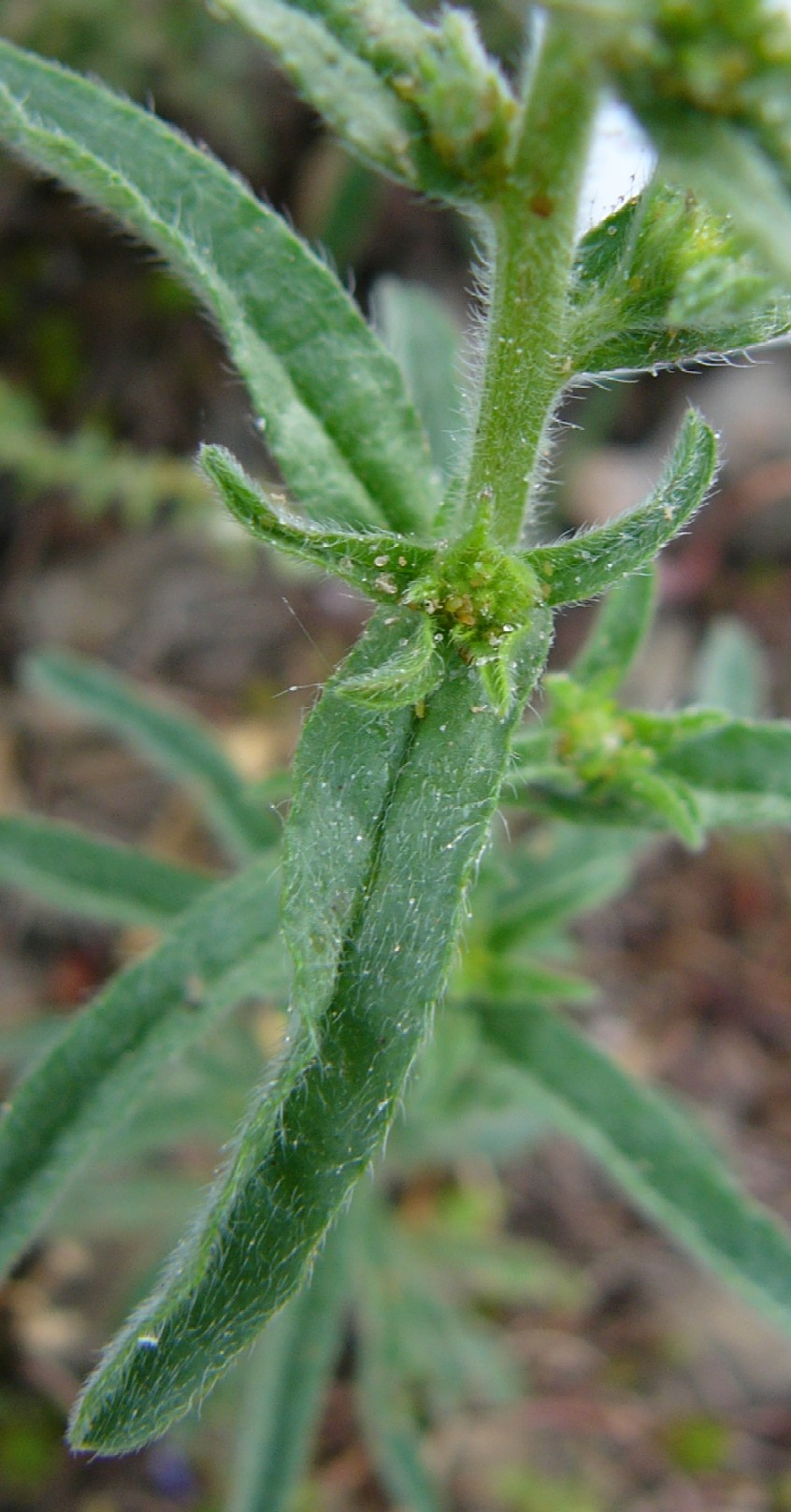 Blätter linealisch- lanzettlich, 30 - 70 mm lang 5 - 8 mm breit, die oberen sitzend Untere Blätter grau, 4 cm lang, 0,4 cm breit