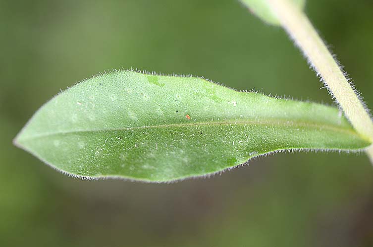 Grundblätter bis 30 cm lang, am Grund +/- keilförmig, ohne oder mit schwachen hellgrünen Punkten, mit 0,1 - 0,5 mm langen Haaren, am Rand borstig
