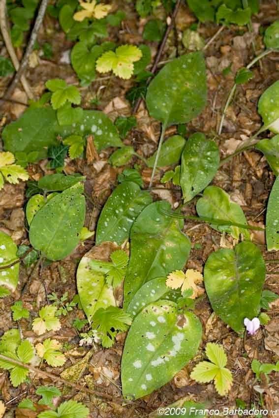 Grundblätter schwach gefleckt, weich, am Rand oft gewellt, oberseits mit dichtem, kurzen Haarbesatz, vielen Drüsenhaaren und wenigen Borsten, Blattstiel meist breit geflügelt