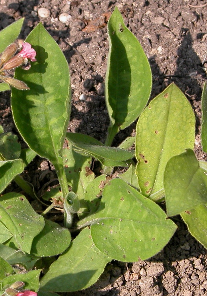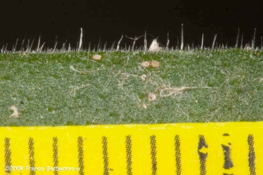2 Grundblätter undeutlich weiß gefleckt, auf der Oberfläche klebrig, weich, mit wenigen Borstenhaaren, am Rand oft gewellt