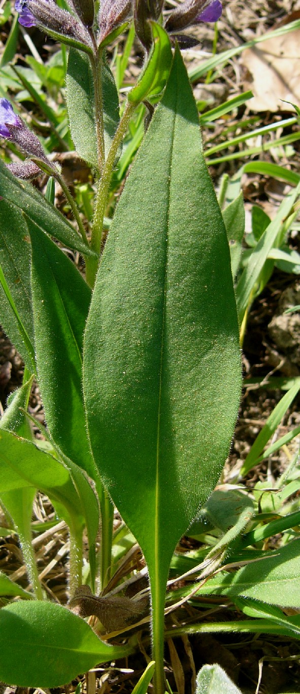 Grundblätter 4 - 6 mal so lang wie breit, länglich- lanzettlich, nach beiden Enden allmählich verschmälert, mit flachem oder welligem Rand