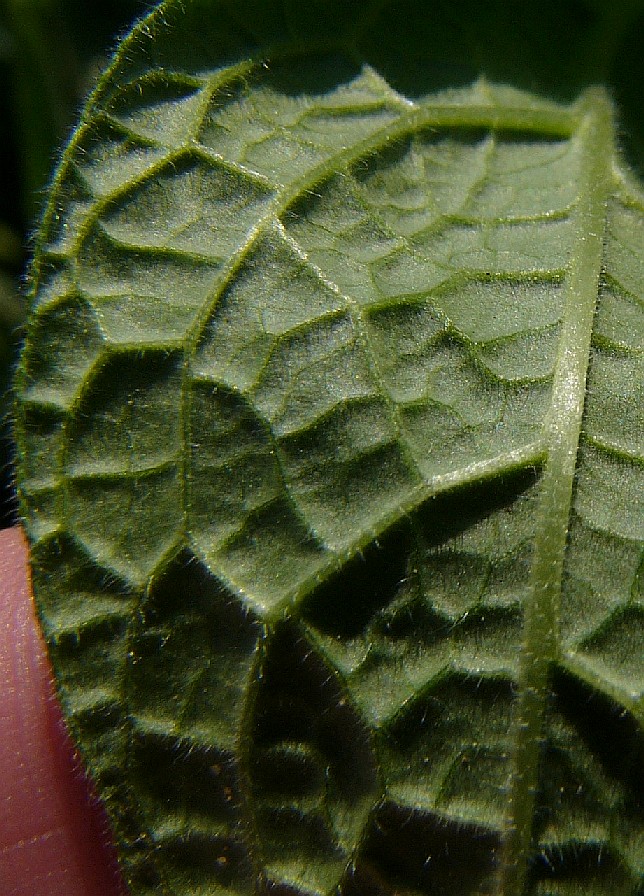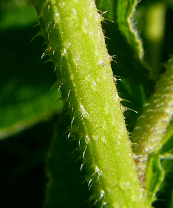 Blätter und Stängel im oberen Teil mit wenigen kleinen, weißen Stacheln auf höckerigem Grund (Beim Trockenen gehen diese Haare oft verloren, so dass die Pflanze kahl erscheint)