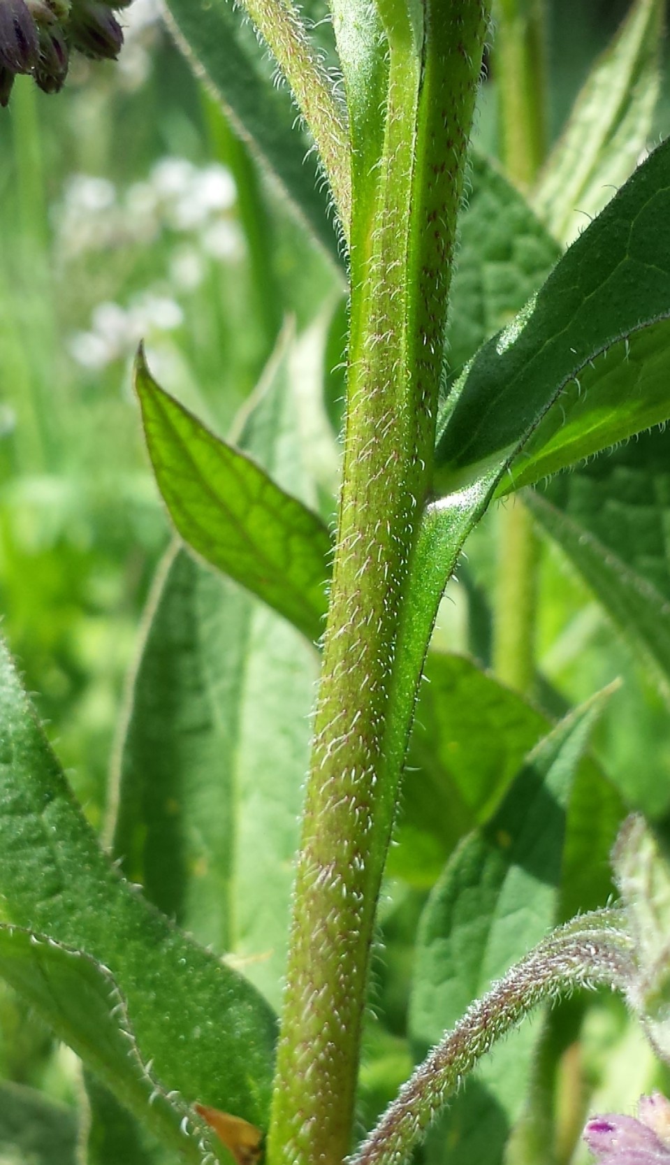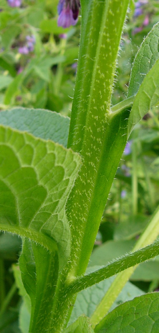 anliegend Stängel und Blätter behaart, Blätter vollständig herablaufend, ca. 2- 3 mm geflügelt Blätter 10 - 35 cm lang, 5 - 10 cm breit,