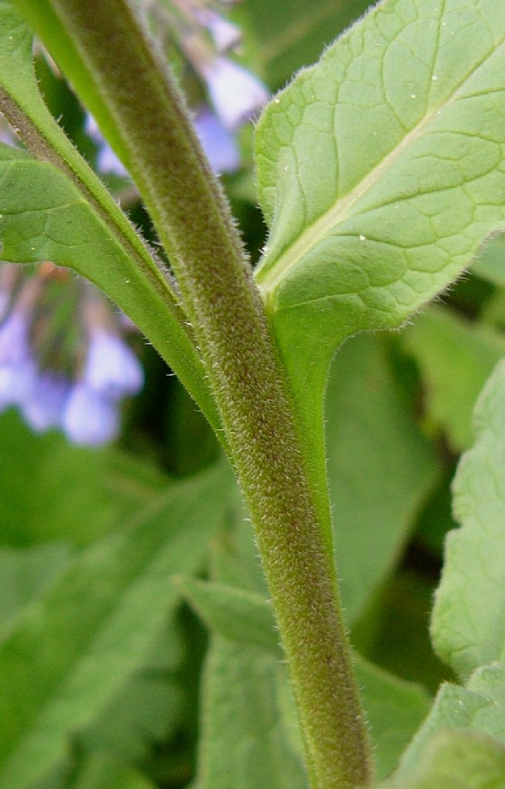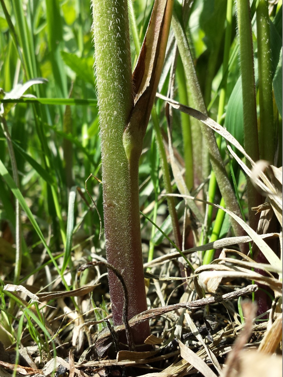 4 Blätter und Stängel mit langen Haaren dicht bedeckt, Stängel 2 - 3 mm geflügelt, Blätter vollständig herablaufend