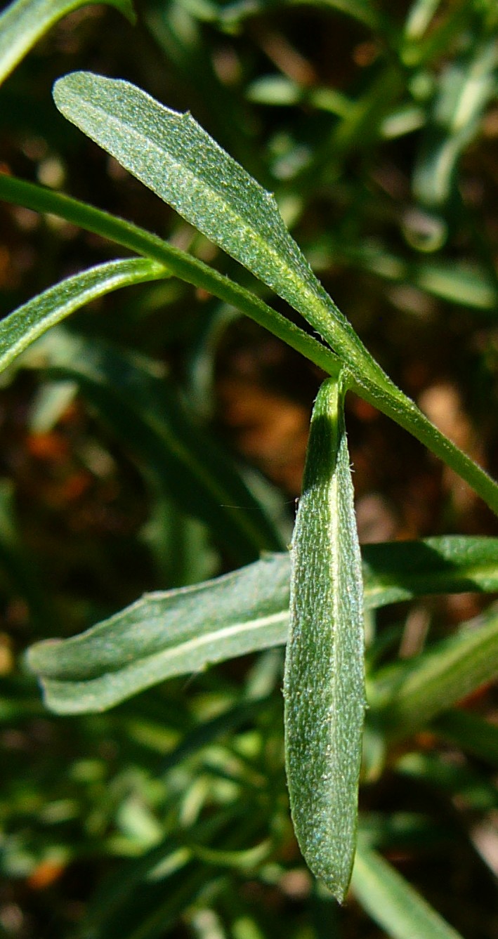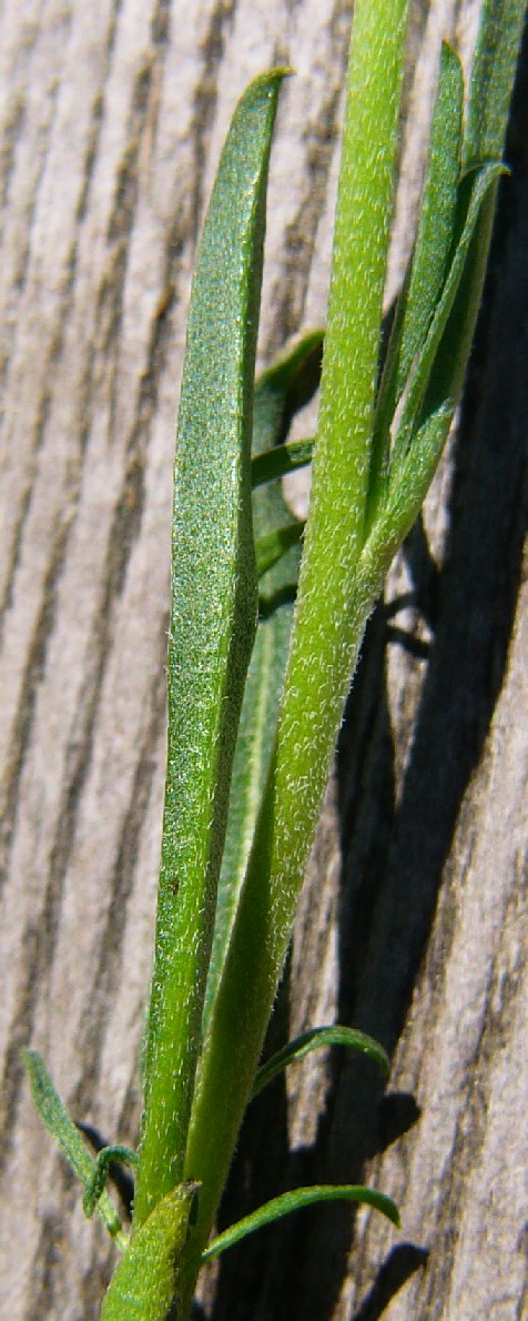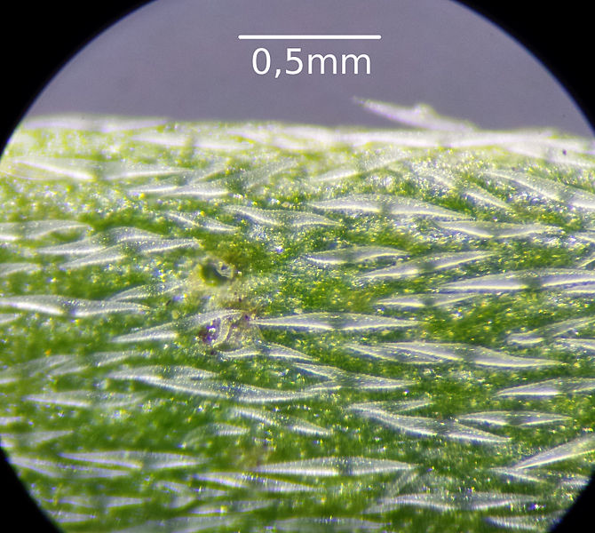 Stängelblätter alle ganzrandig, schmal- bis breitlanzettlich, stumpflich, mittlere und obere meist zurückgekrümmt, mit überwiegend 2- schenkligen Haaren (Kompassnadelhaare) besetzt