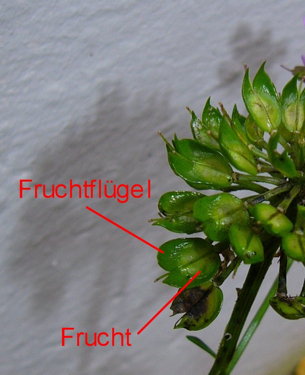 Schötchen flach, Frucht bis zur Basis geflügelt (hier: Flügel sind dunkler grün)