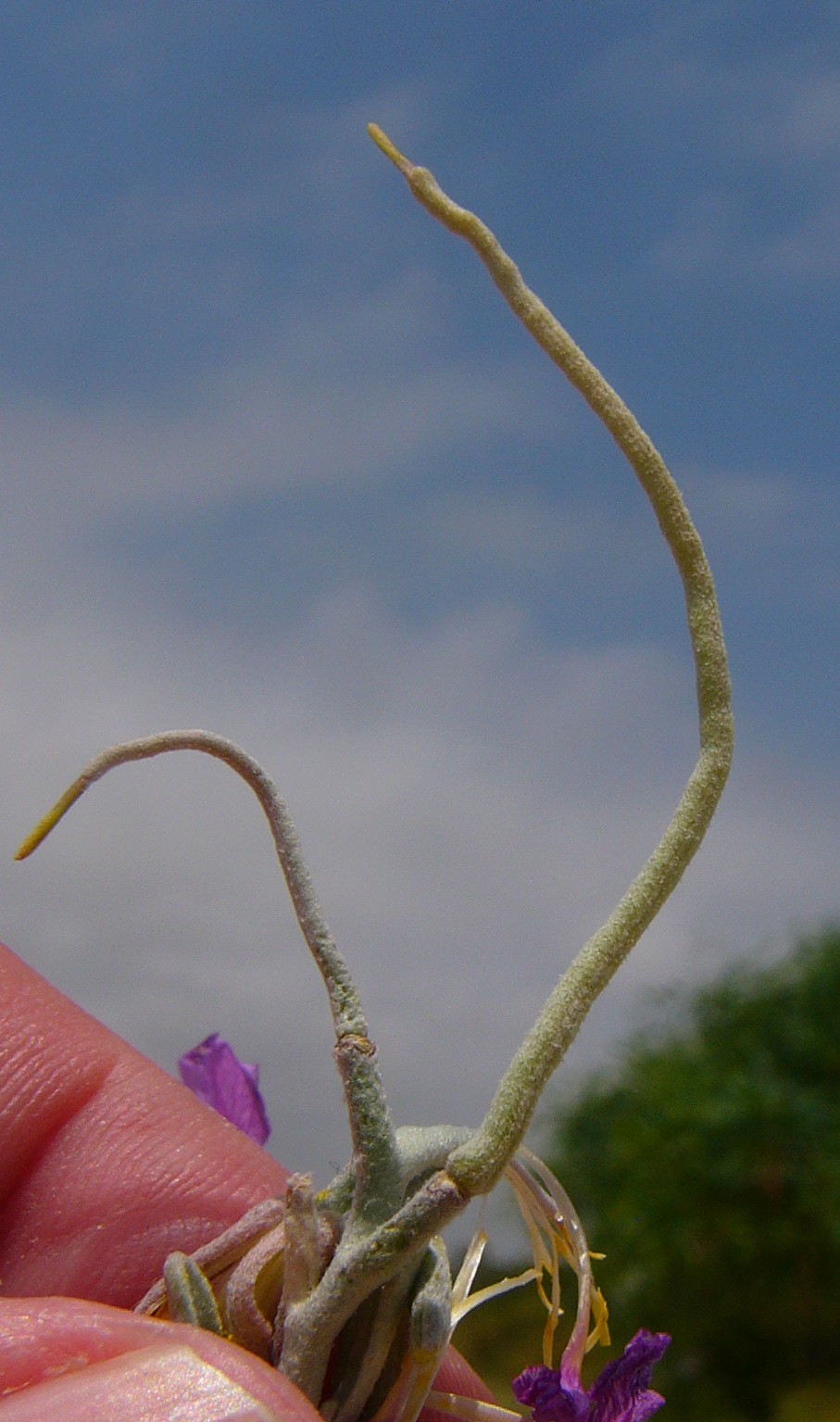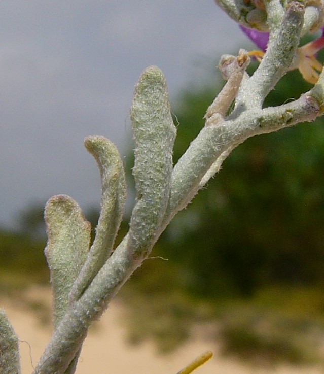 Pflanze 10 - 40 cm groß mit vielen nichtblühenden Ästen Blüten violett oder rosa, Zumindest 2 Kelchblätter ausgesackt Schoten schlank, oft gedreht oder geknickt, dicht filzig, ca. breit