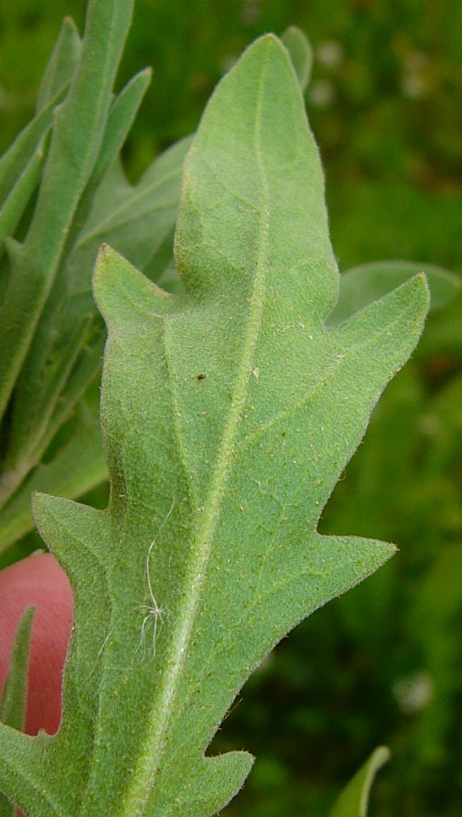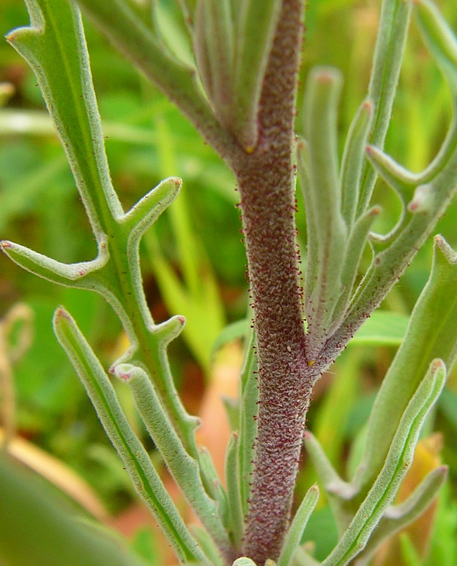 Blüten sitzend oder sehr kur gestielt; Kelchblätter aufrecht, mehr als 6 mm lang, mit kurzen, angedrückten Sternhaaren Schoten stielrund, Hörner deutlich länger als die Narbe Stängel oft mit kurzen Drüsenhaaren Blätter gebuchtet bis fiederteilig, graufilzig