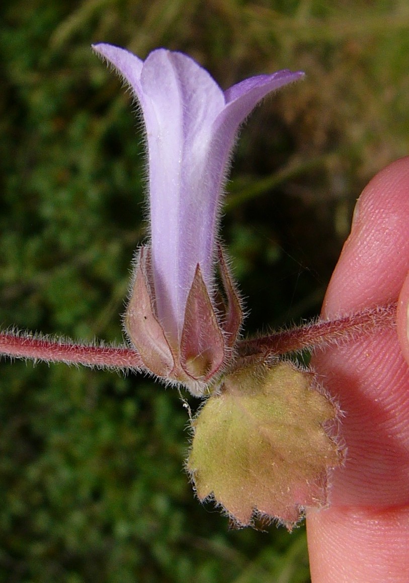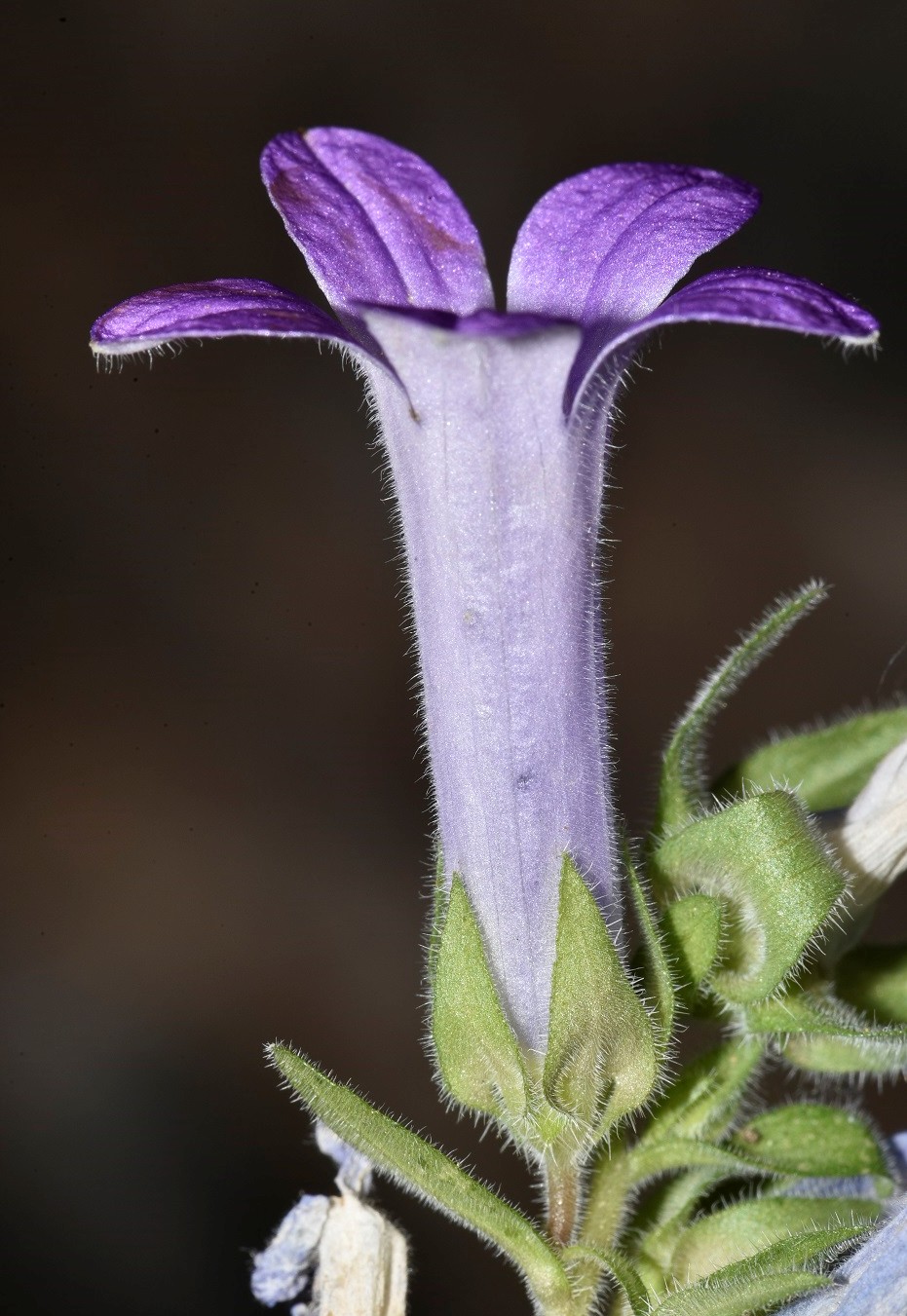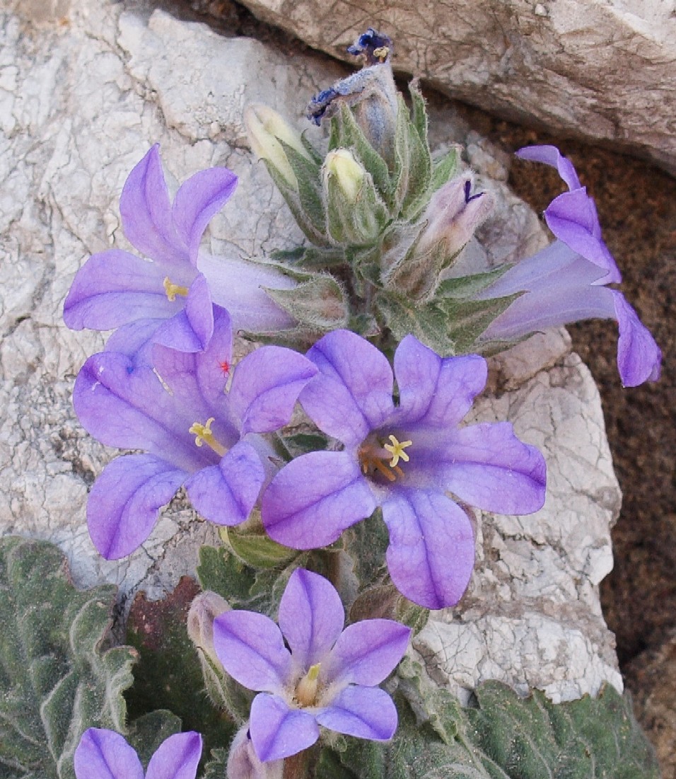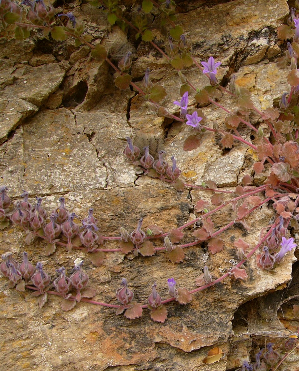 Pflanze 20 - 40 cm groß, an einer Felswand ausgebreitet, Blüten röhrig, 12 - 15 mm lang, innen blau, 5 Narben