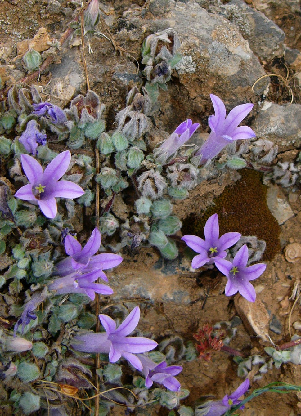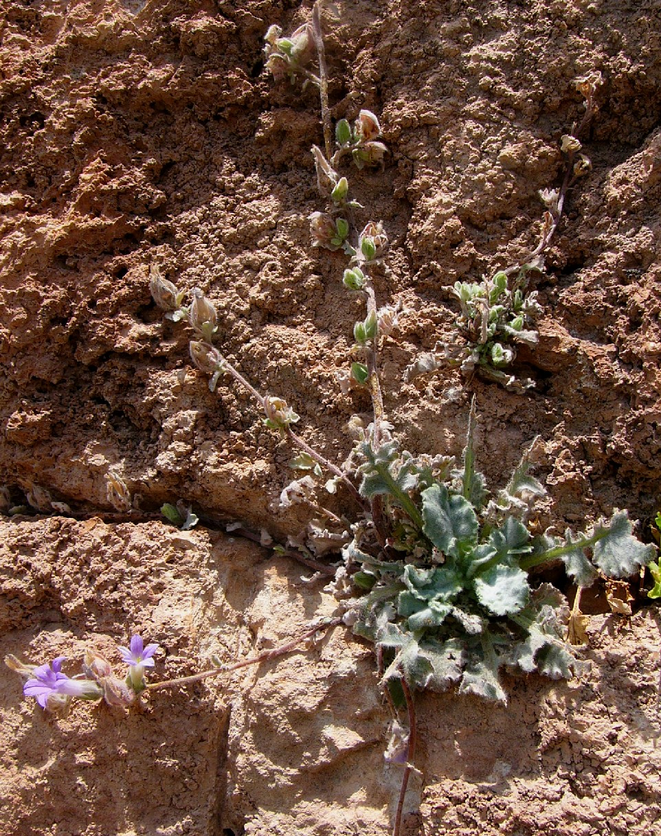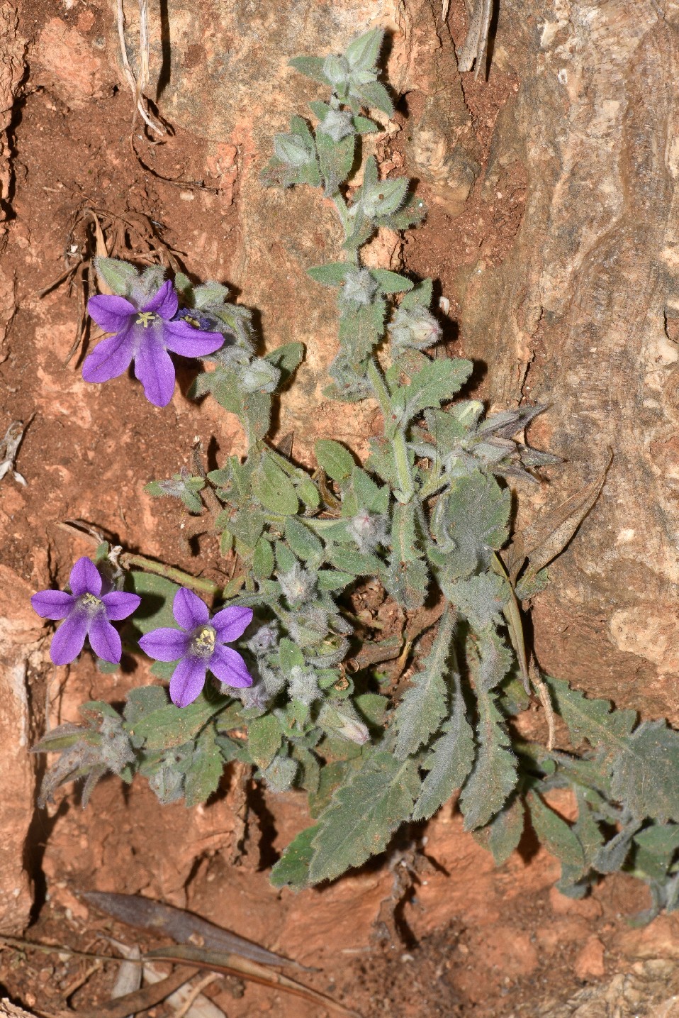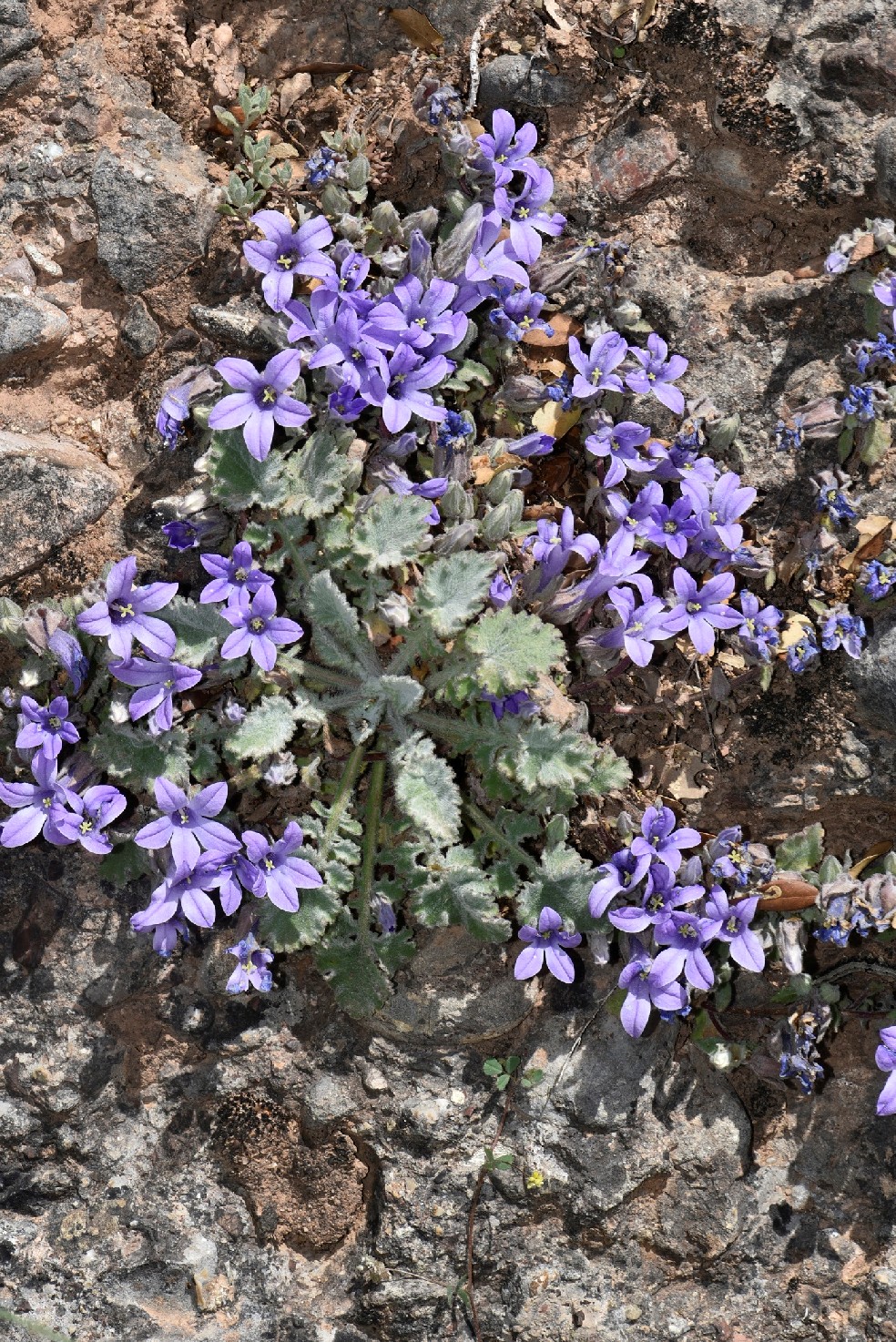 Pflanze 20 - 40 cm groß, an einer Felswand ausgebreitet, Blüten röhrig, 12 - 15 mm lang, innen blau, 5 Narben