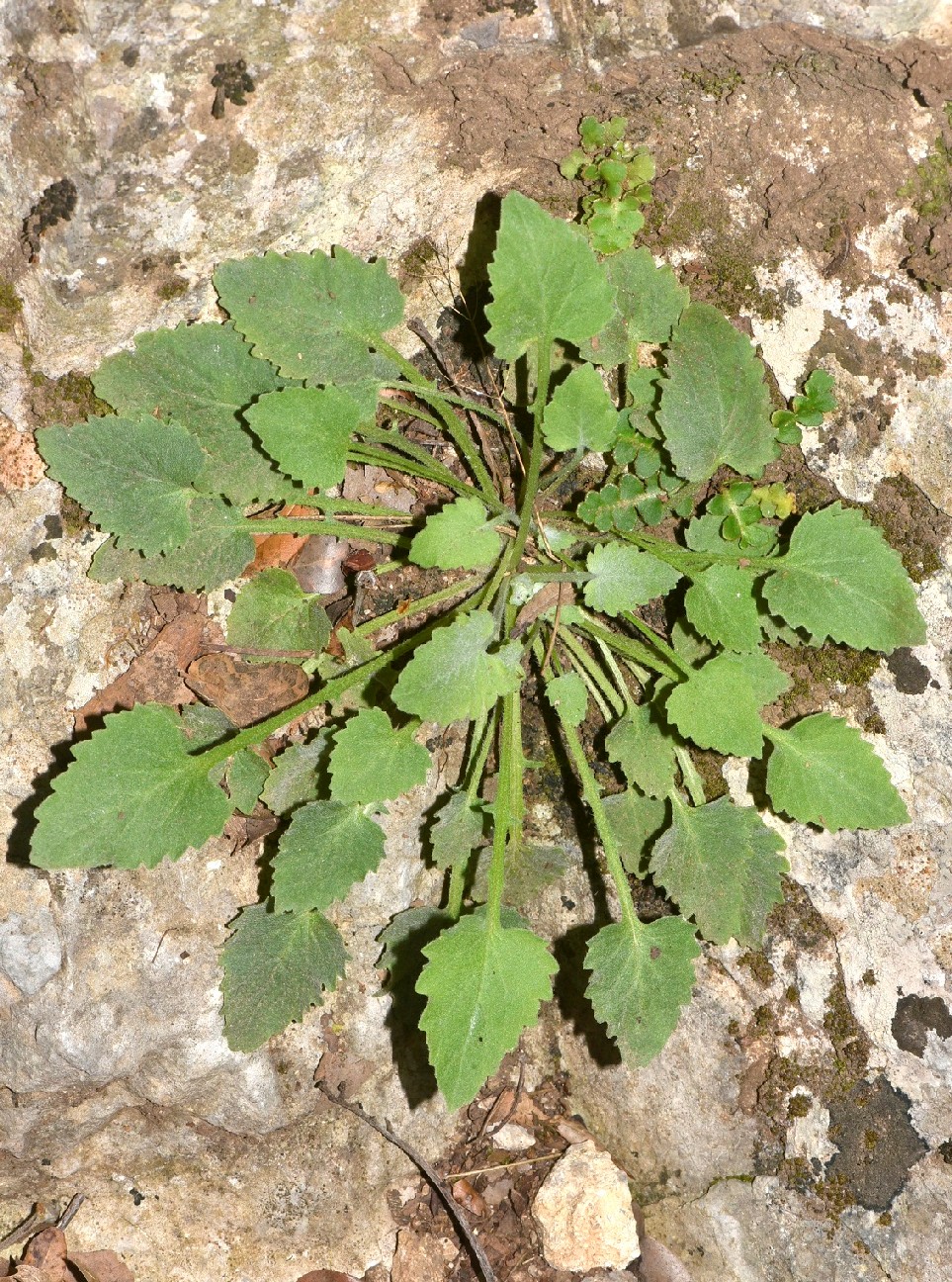 Blattrosette mit wenigen, dicht beblätterten Stängeln, Grundblätter +/- dreieckig oder oval- herzförmig, gewellt,