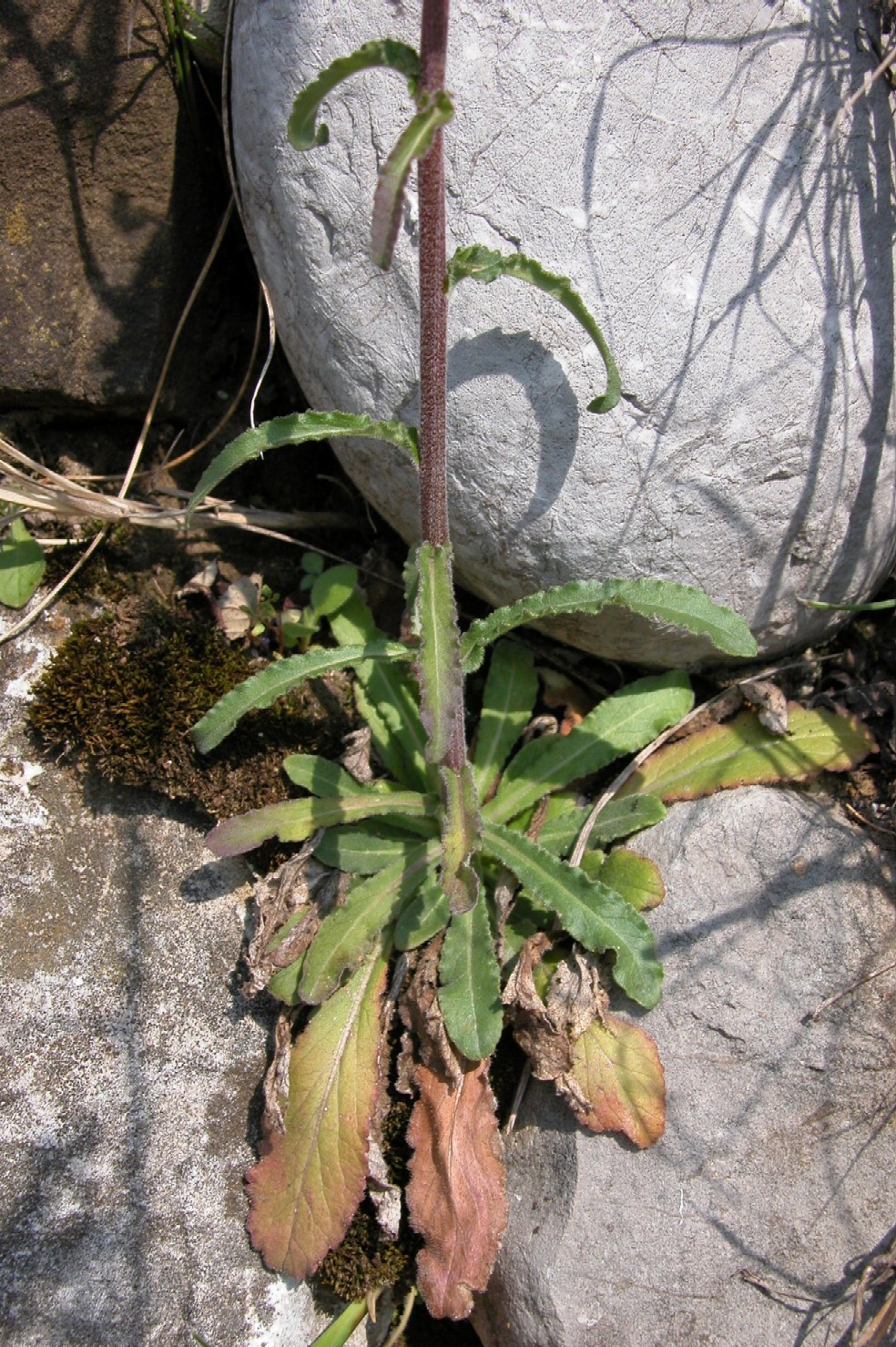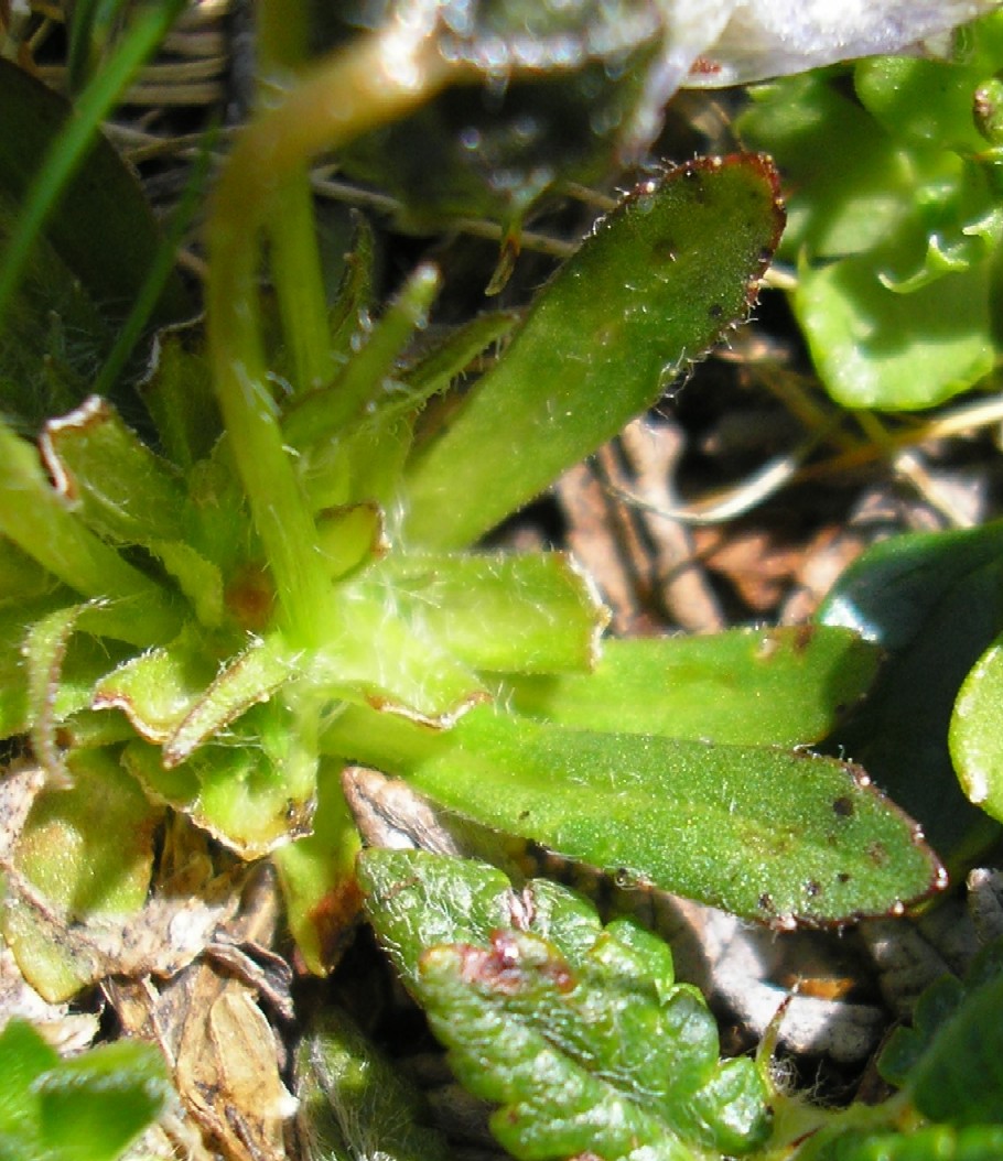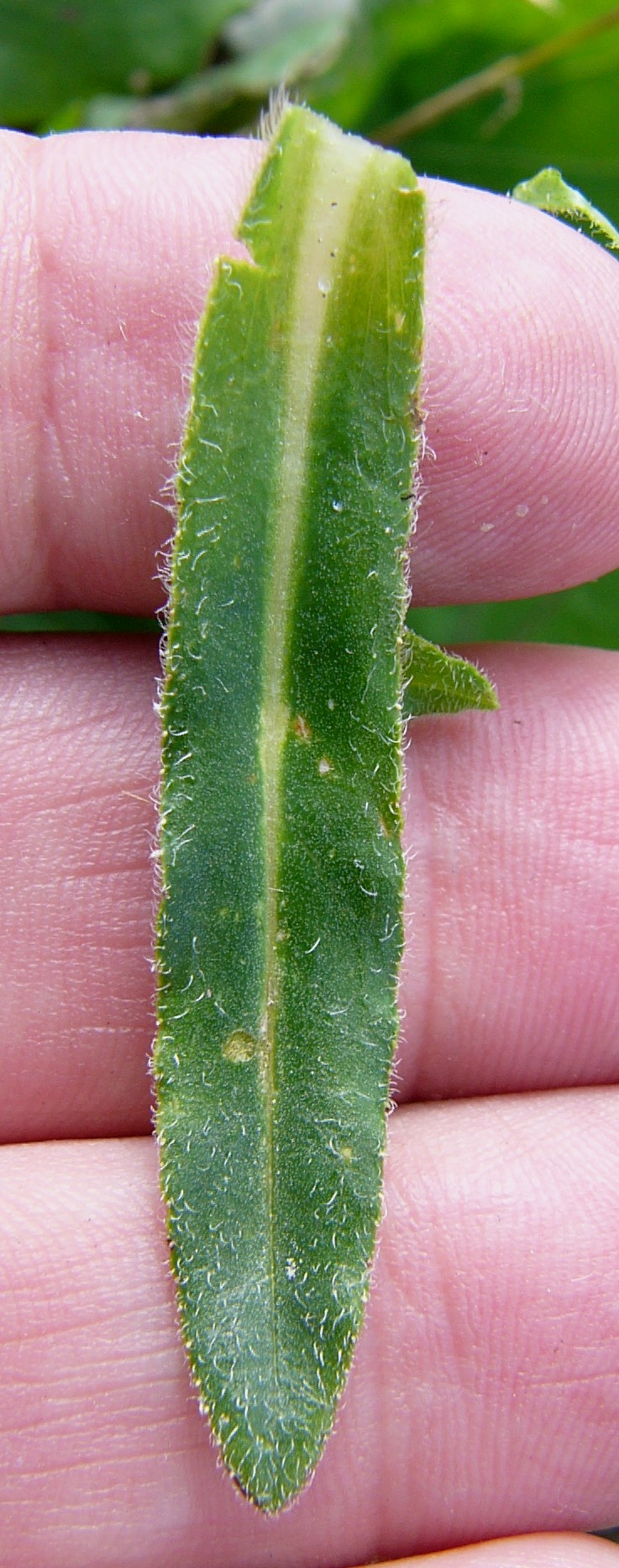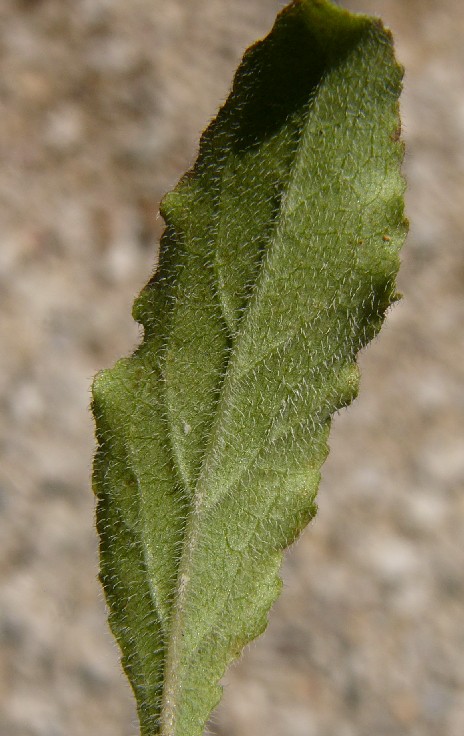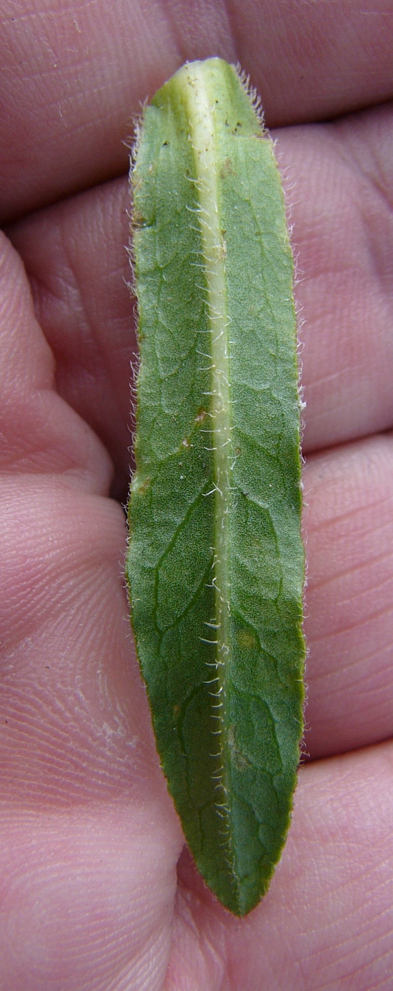 Grundblätter rosettig, schmal lanzettlich, ganzrandig bis schwach gezähnt, stumpf, dicht behaart