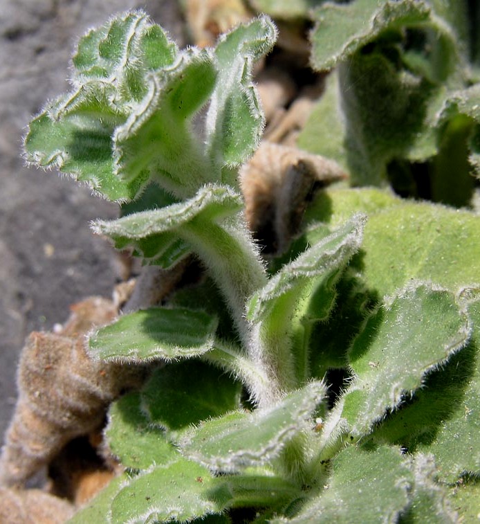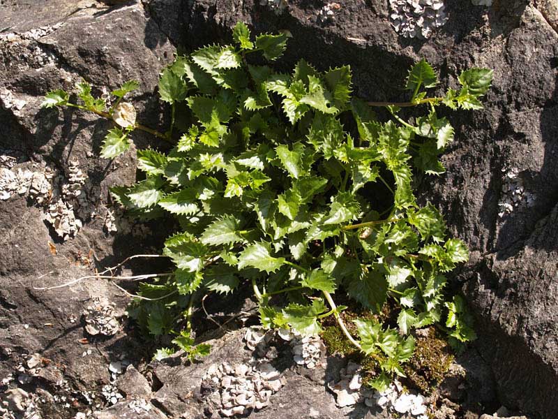 Stängelblätter oval, stark behaart, unregelmäßig buchtig gezähnt, kleiner als die Grundblätter