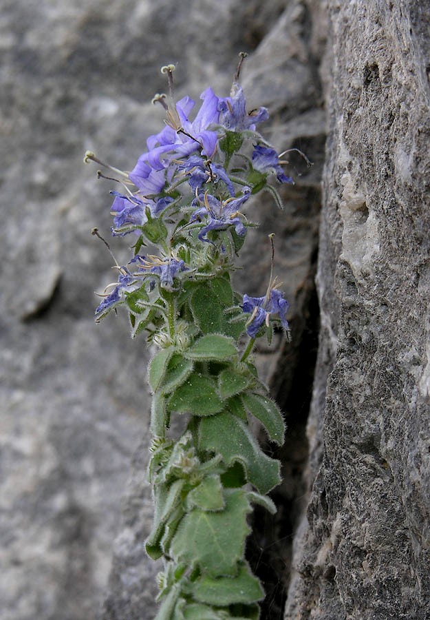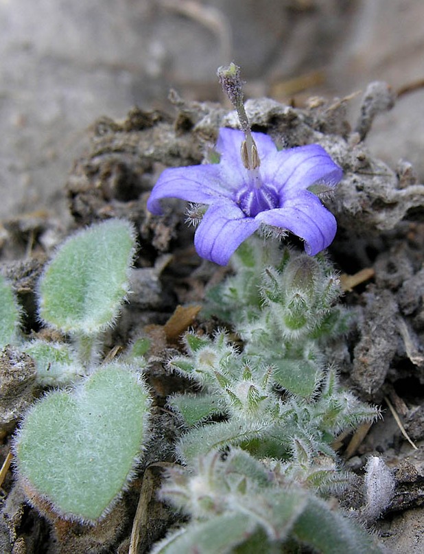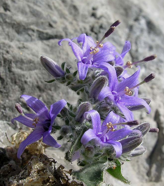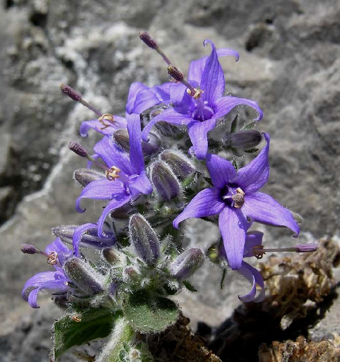 Blüten hellblau, 1,8 - 2 cm im Durchmesser, zu 1/3 - 1/2 verwachsen, außen dicht bewimpert,
