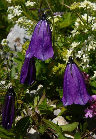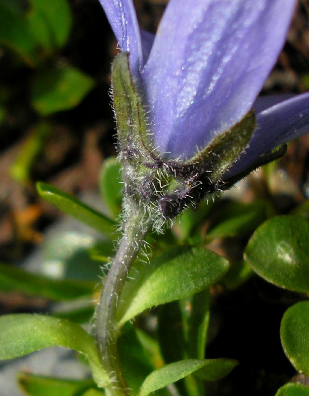 Blüten dunkelviolett, 15 - 25 mm, nickend, Kelchblattzipfel pfriemlich, oft der Blüte anliegend