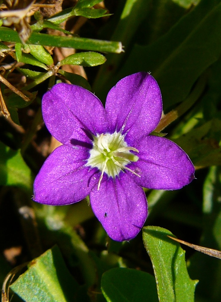 Blüten dunkelviolett, 15 - 20 mm im Durchmesser, mit deutlich abgegrenztem, kleinem grünlichweißem Zentrum,