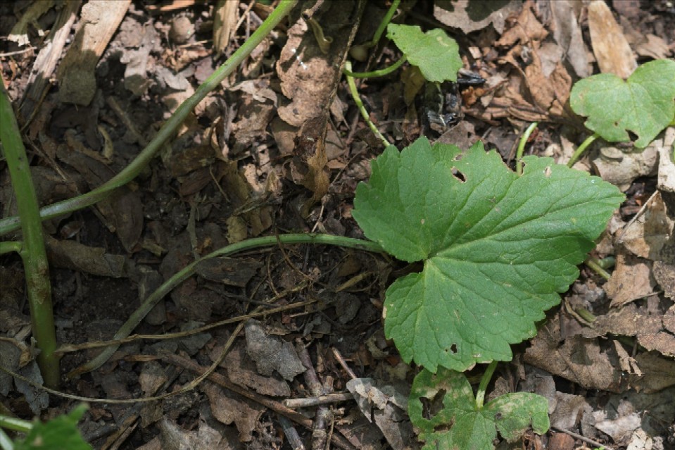 Spreite der Grundblätter in etwa so breit wie lang, scharf gezähnt, mit herzförmigem Grund