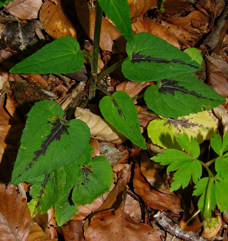 Grundblätter erscheinen vor der Blüte, eiförmig, lang gestielt, ca. 2 mal so lang wie breit, oft schwarz gefleckt, Blattrand doppelt gezähnt