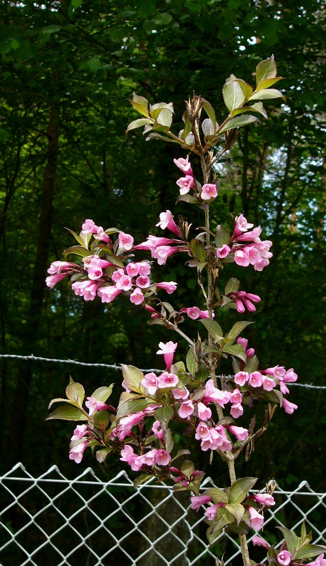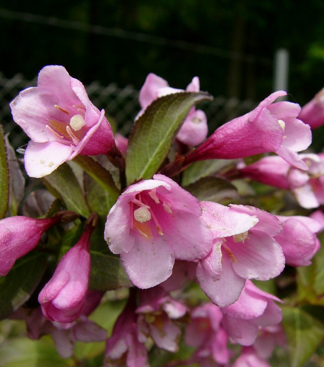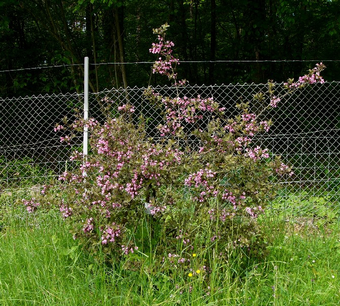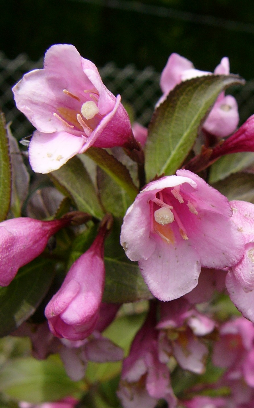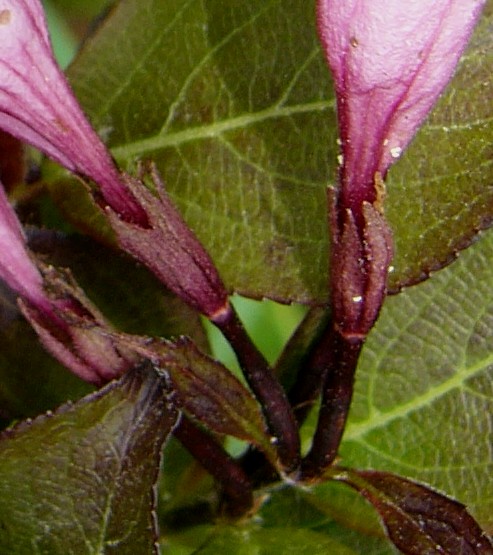 1 - 2 m großer Strauch Blüten rosa oder weiß, in 5 - 7 cm breiten Trugdolden Krone 1,5 cm lang, glockig, 5-zipfelig, zartrosa, im behaarten Schlund gelb-orange Hellere Sorte Kelch mit 5 schmalen Zipfeln, Blütenstiel stark behaart Früchte = borstig behaarte Kapseln