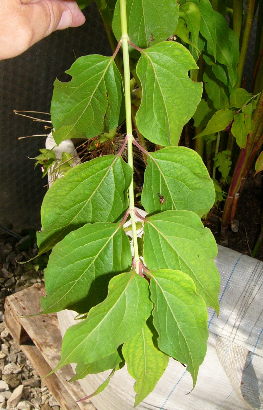 gegenständig, eiförmig, 4 - 13 cm lang, gestielt, Blätter unterseits blaugrün, mit deutlichen Quernerven Zweige grün, hohl