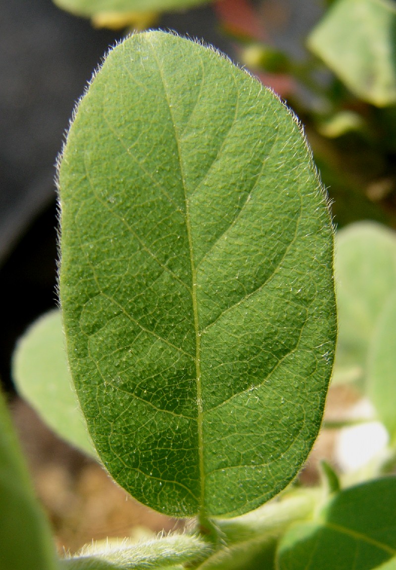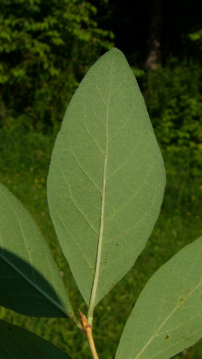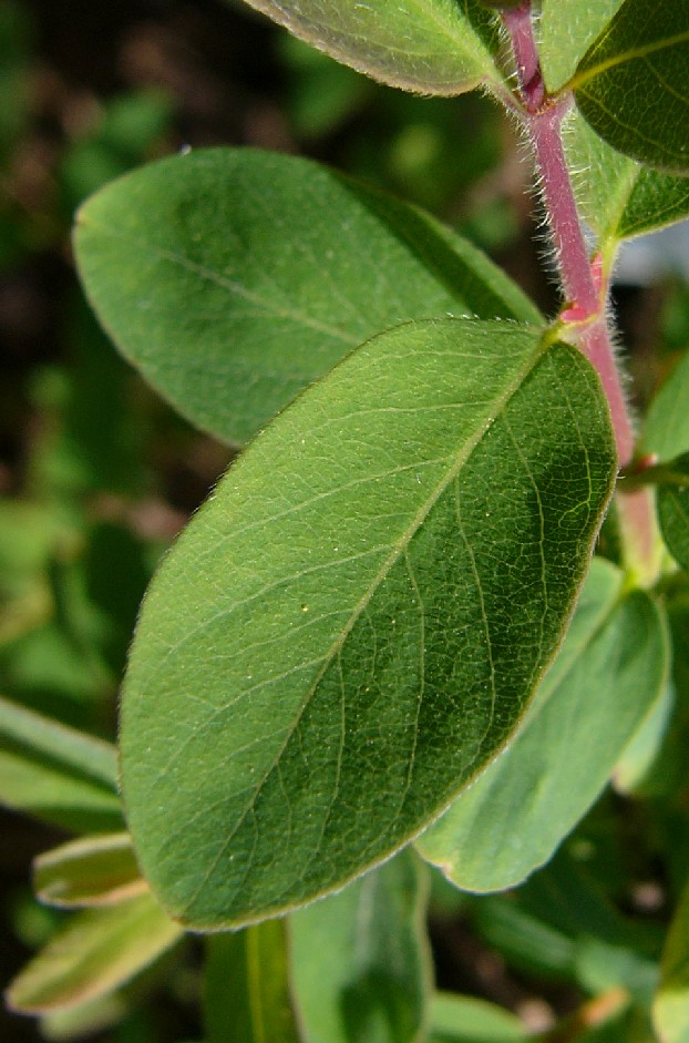 Triebe kahl, Blätter länglich- eiförmig bis länglich- lanzettlich, 2 - 4 cm lang, kurz gestielt