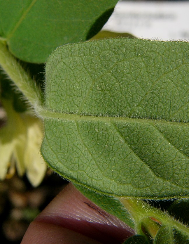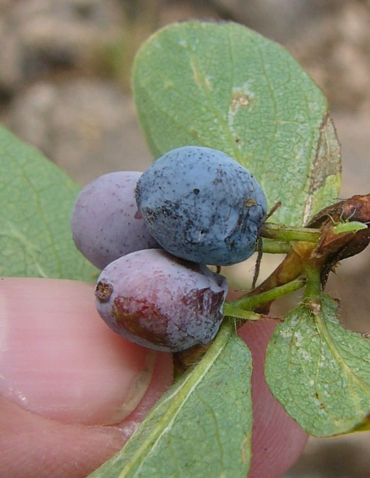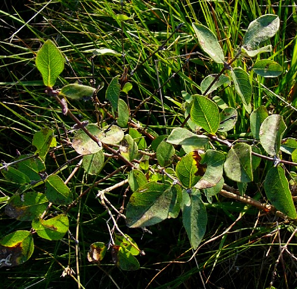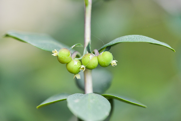 0,6 - 1,3 m hoher aufrechter Strauch Blüten zu 2, gelblich- weiß, fast radiär Doppelbeeren blauschwarz, bereift, wohlschmeckend Blätter rundlich eiförmig, 4 - 10 cm lang, im Sommer nicht verkahlend Blätter unterseits blaugrün, +/- behaart Blattstiele stark behaart