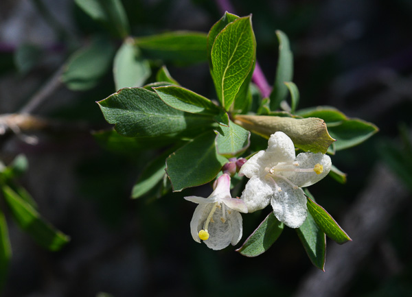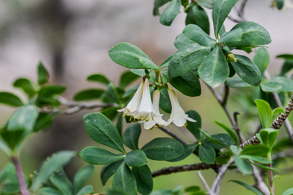 0,6 - 1,3 m hoher aufrechter Strauch Blüten zu 2, gelblich- weiß, fast radiär Gemeinsamer Blütenstiel kürzer als die Blüten Doppelbeeren blauschwarz, bereift, nicht wohlschmeckend Blätter rundlich eiförmig, 2 - cm lang, im Sommer verkahlend Blätter unterseits blaugrün, +/- kahl Äste rötlich- braun, markig