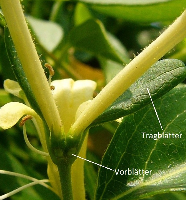 später gelblich weiß oder weiß Kronröhre außen drüsig Oberlippe oft zurückgebogem, Unterlippe schmal Obere Blätter nicht verwachsen Tragblätter schmal dreieckig, 2 - 3 mm lang, Vorblätter rundlich, ca. 2,5 mm im Durchmesser Früchte korallenrot, giftig Zweige jung drüsenhaarig, oft rötlich überlaufen