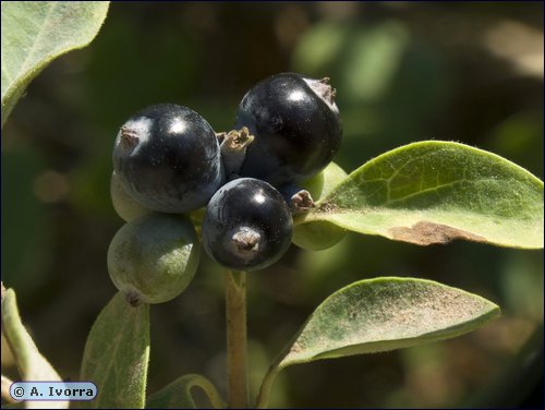 2 Blüten paarweise, oft jedoch am Triebende gehäuft, Beeren schwarzblau
