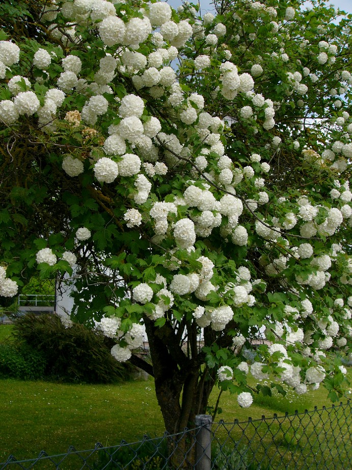 1,50 - 3 m hoher Strauch Blüten in vielblütigen Trugdolden Blütenstände innen mit kleinen fertilen und außen mit großen sterilen Blütens Sterile Randblüten mit 5 meist weißen Kronblättern Randblüten seltener auch gelb Fertile Blüten mit 5 Staubblättern Früchte scharlachrot Blätter 3 - 5- lappig Blattspreite 6 - 12 cm lang, 5 - 10 cm breit, 1 - 5 cm lang gestielt Blätter unterseits vor allem auf den Blattadern behaart